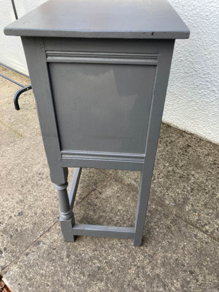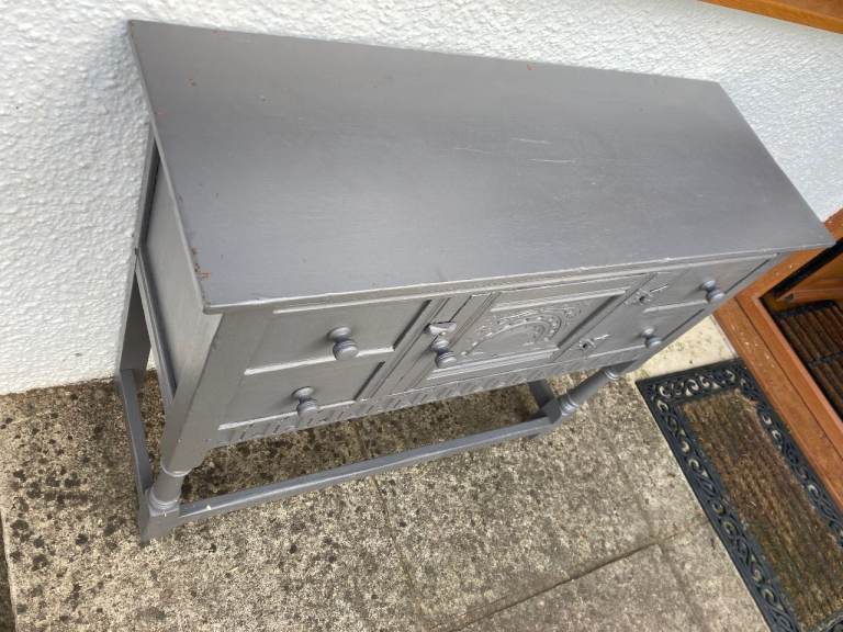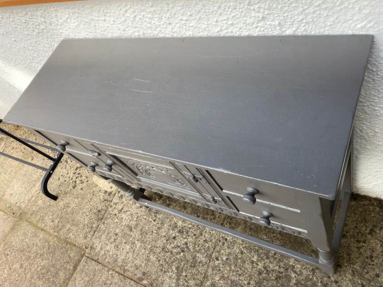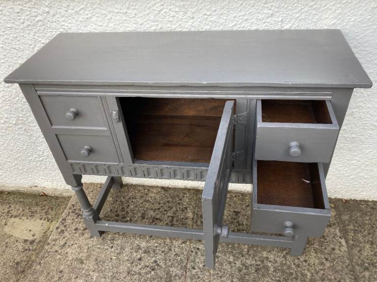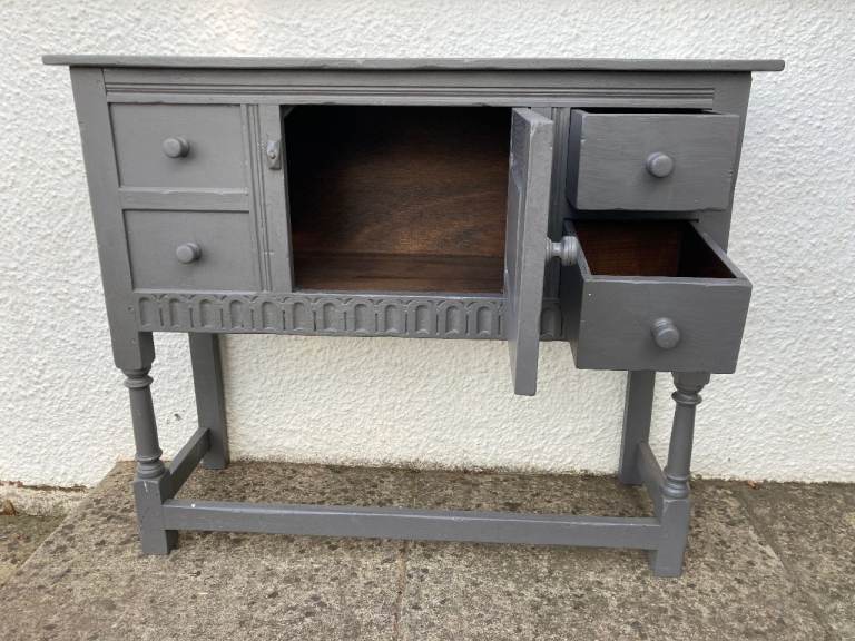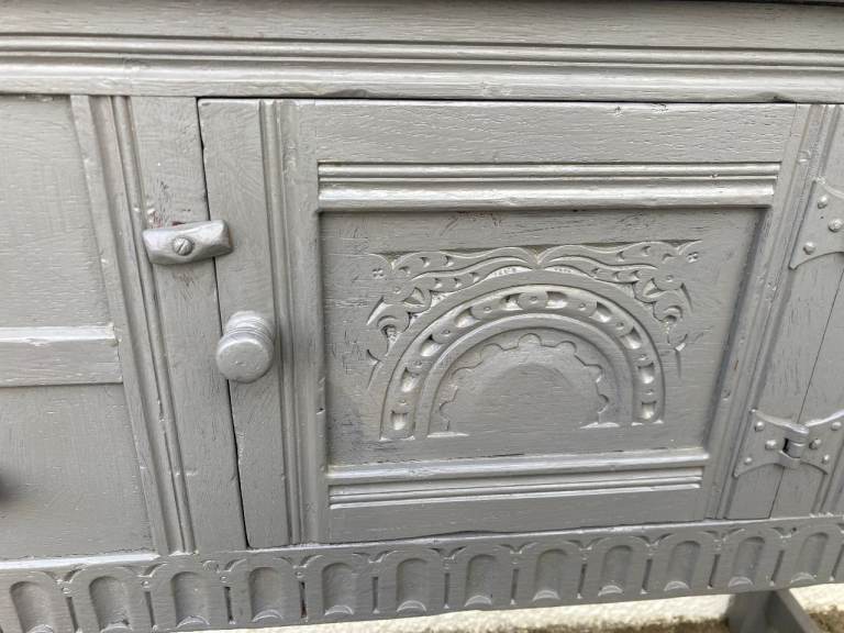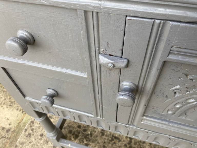 Old Charm/Jacobean style grey painted sideboard. 2 drawers and cupboard.