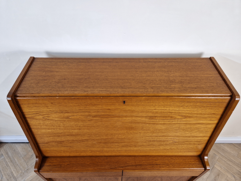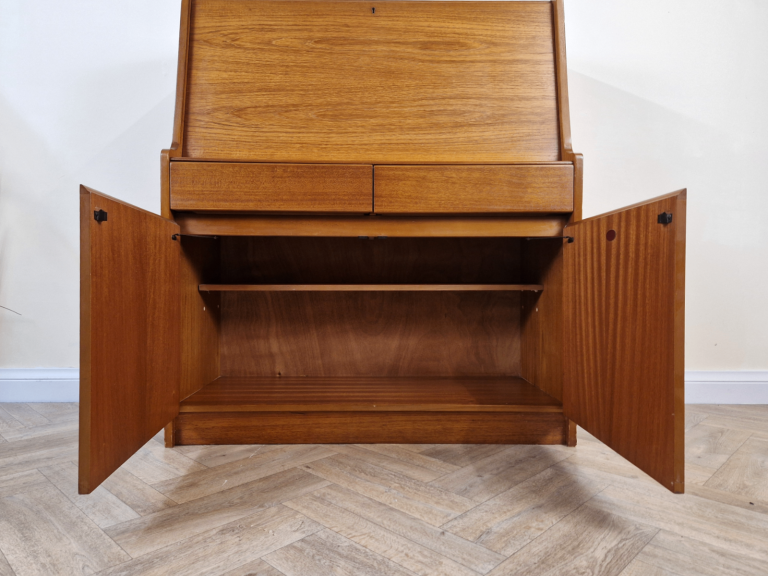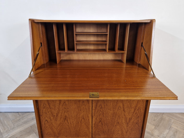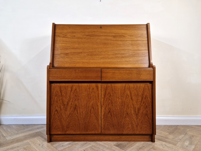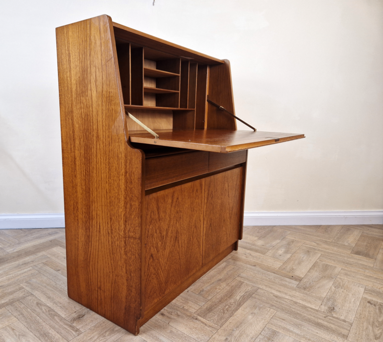 Stunning mid century writing bureau by premium makers Remploy. Featuring a drop down writing desk with stationary tidy, 2 pull out drawers and additional storage this striking item is typical of sleek iconic Scandi inspired designs of the era.