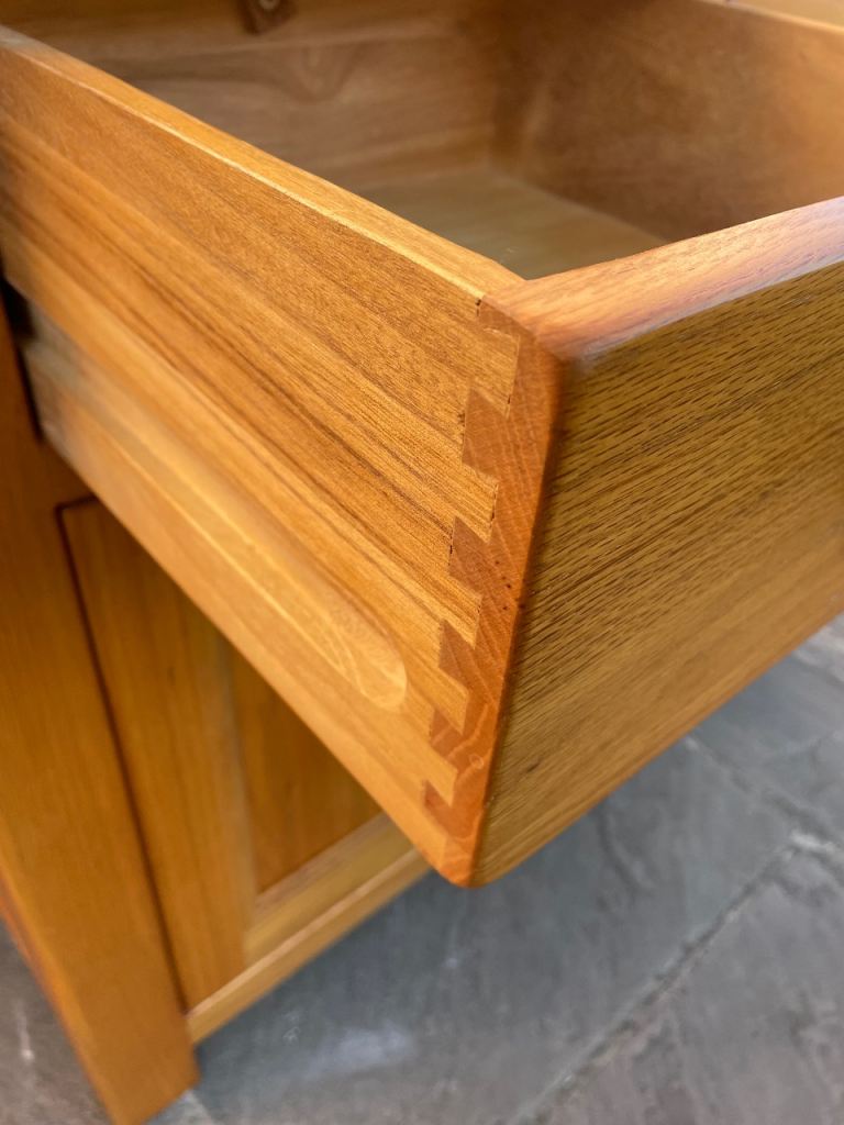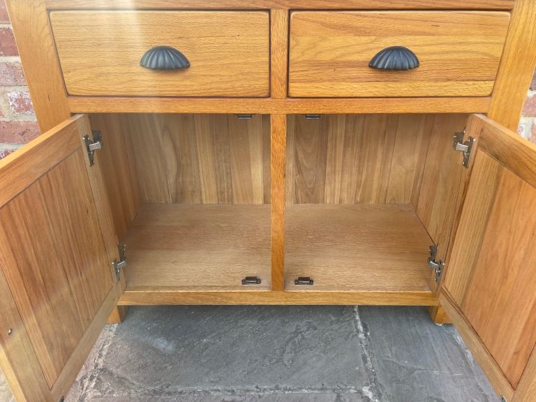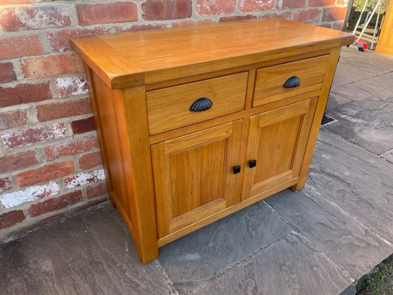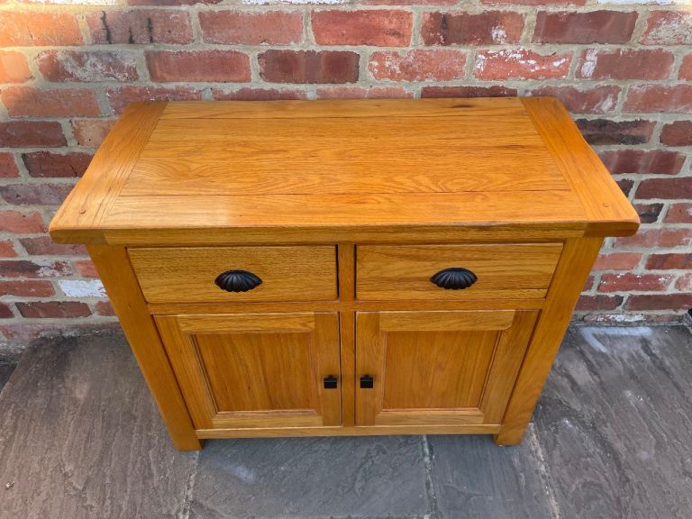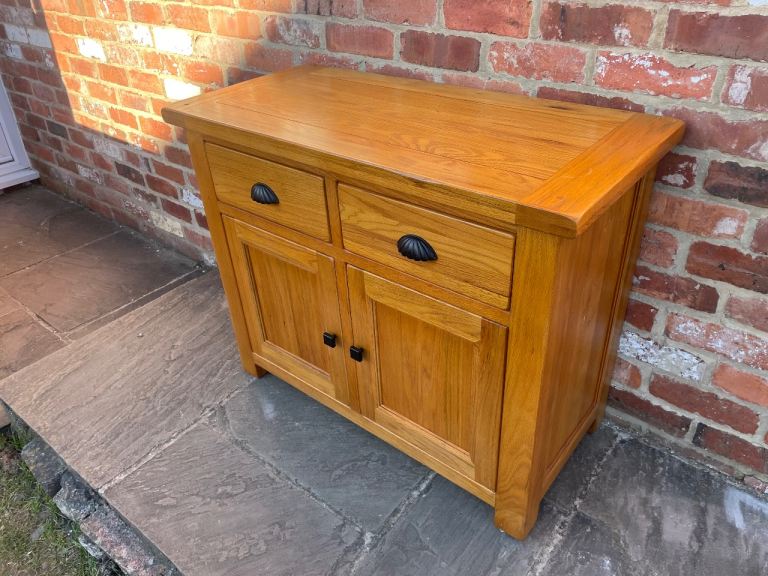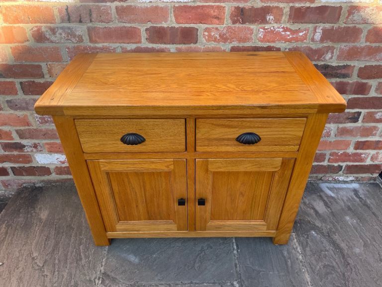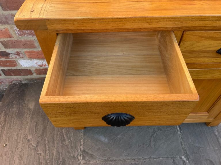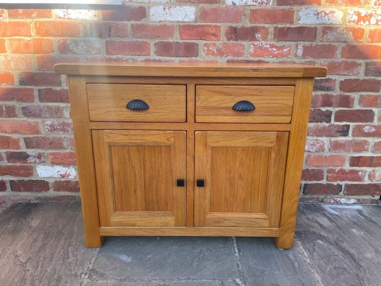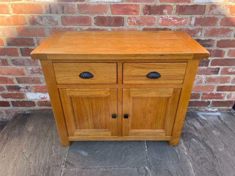 This is a beautiful rustic solid oak sideboard in good, clean condition. Constructed from 100% premium grade solid oak wood, this sideboard would be perfect for organising your belongings and clutter around the house. Featuring 2 deep drawers, made with solid oak bases, backs, sides and runners as well as dovetail joints for extra strength. Moreover, a spacious cupboard below behind 2 doors. Cost £499 new.