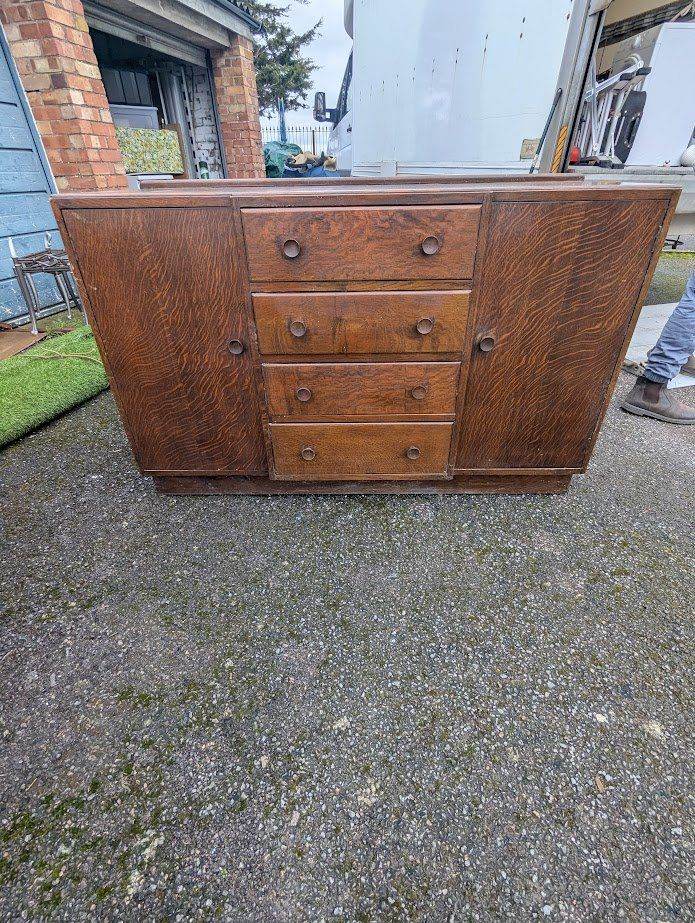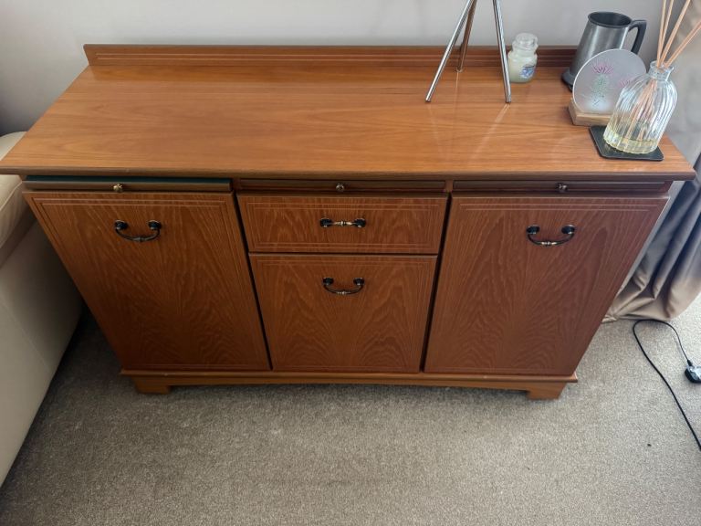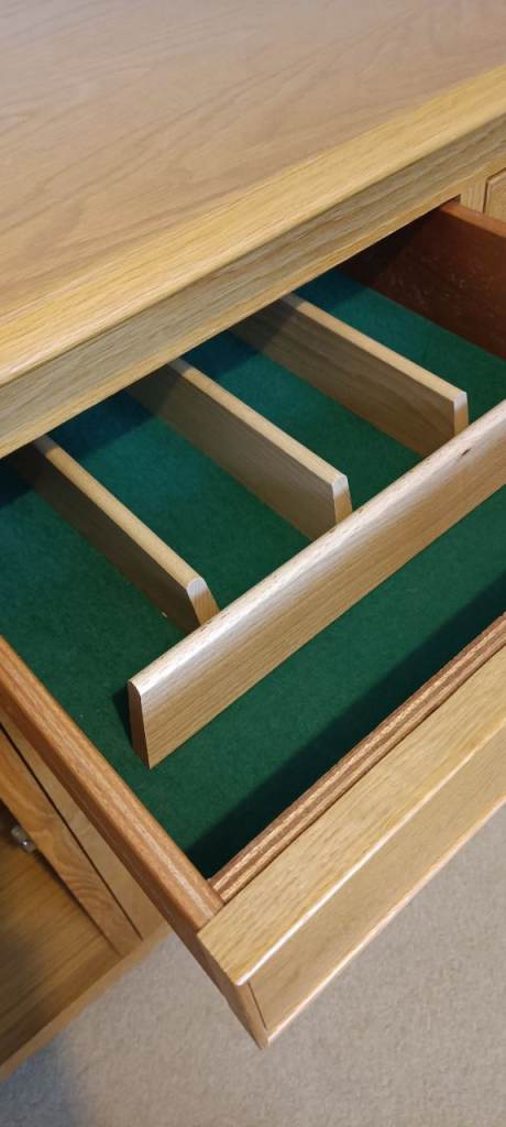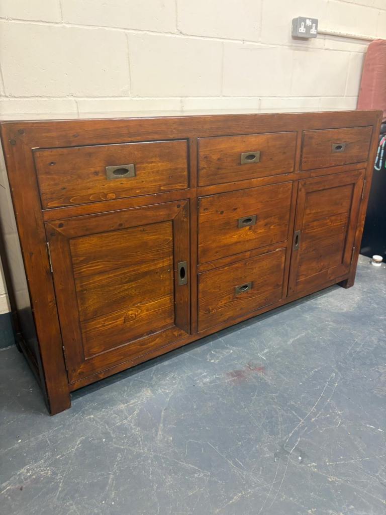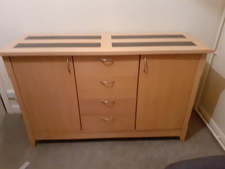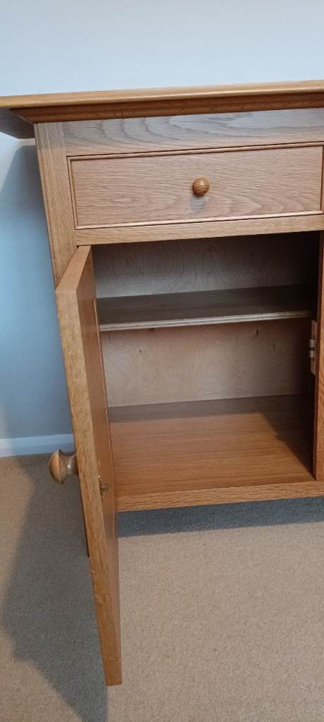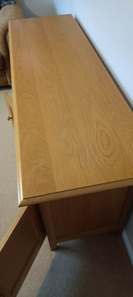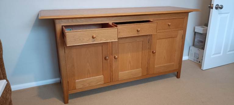 Shaker Style sideboard in oak for sale. This is in great unmarked condition. Three drawers, one for cutlery, and 3 cupboard doors below with shelves. Originally bought from M&S.
