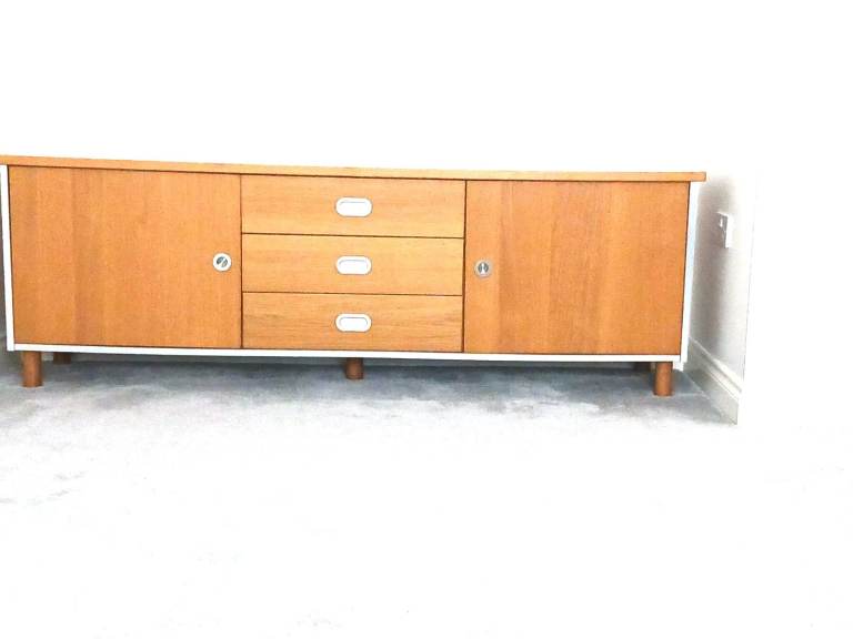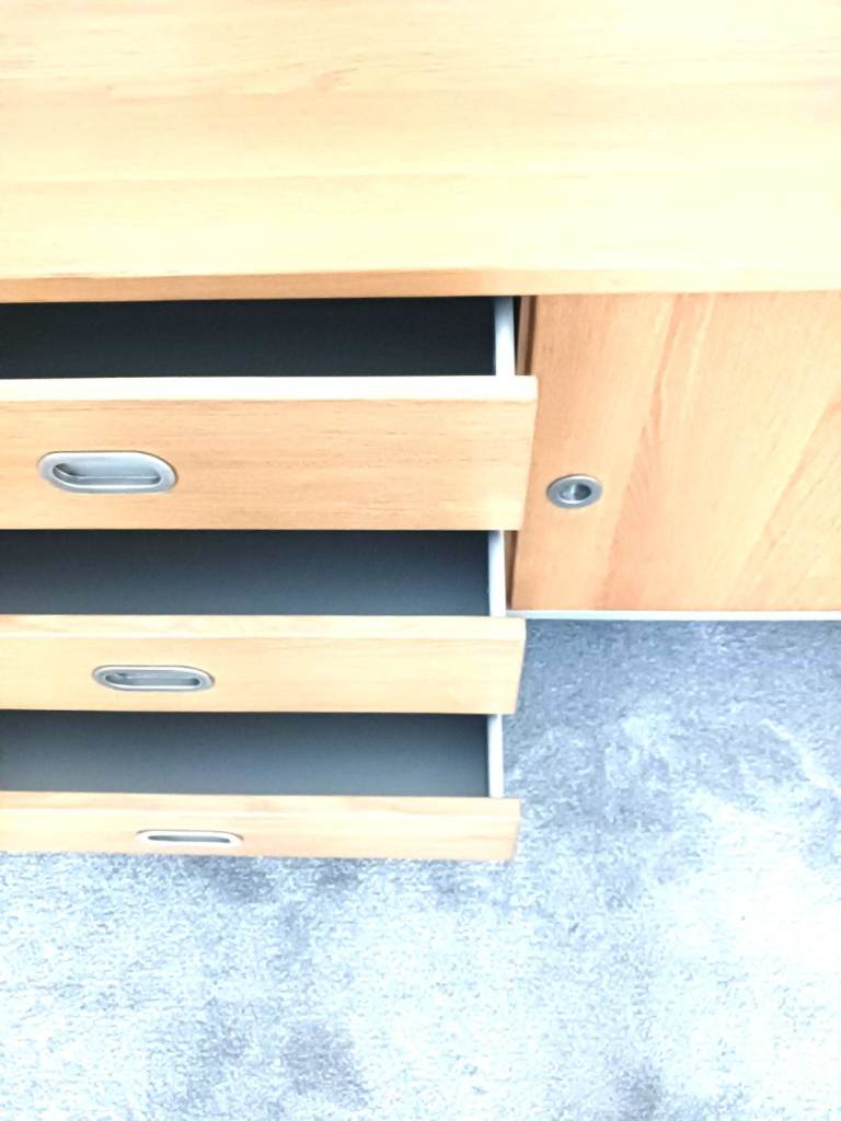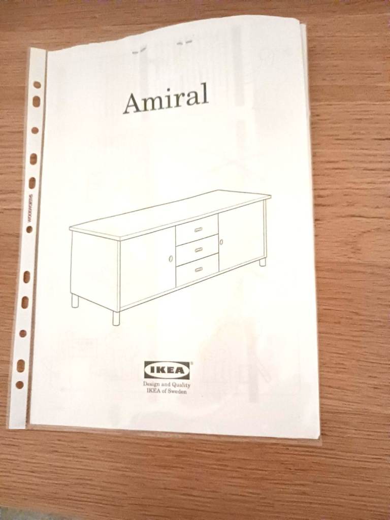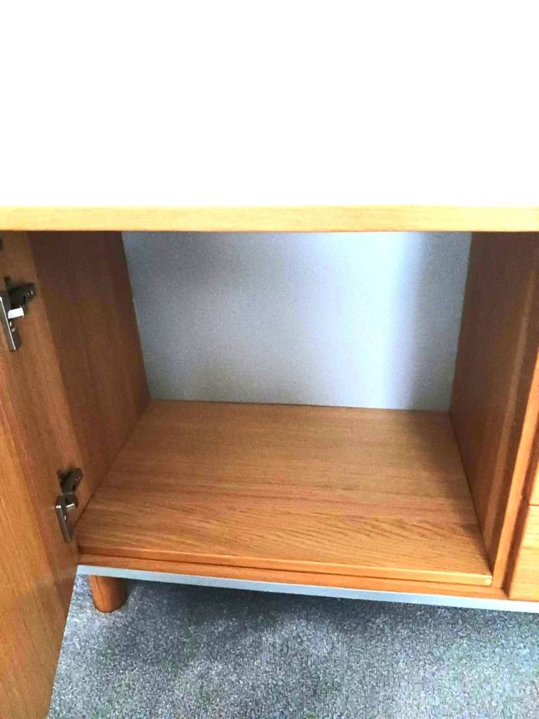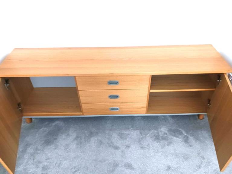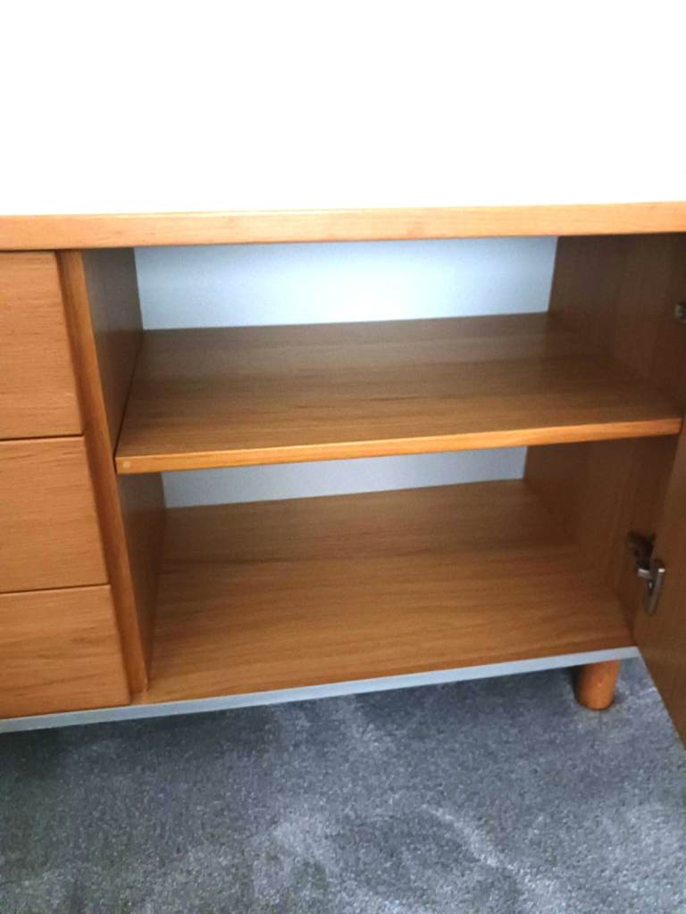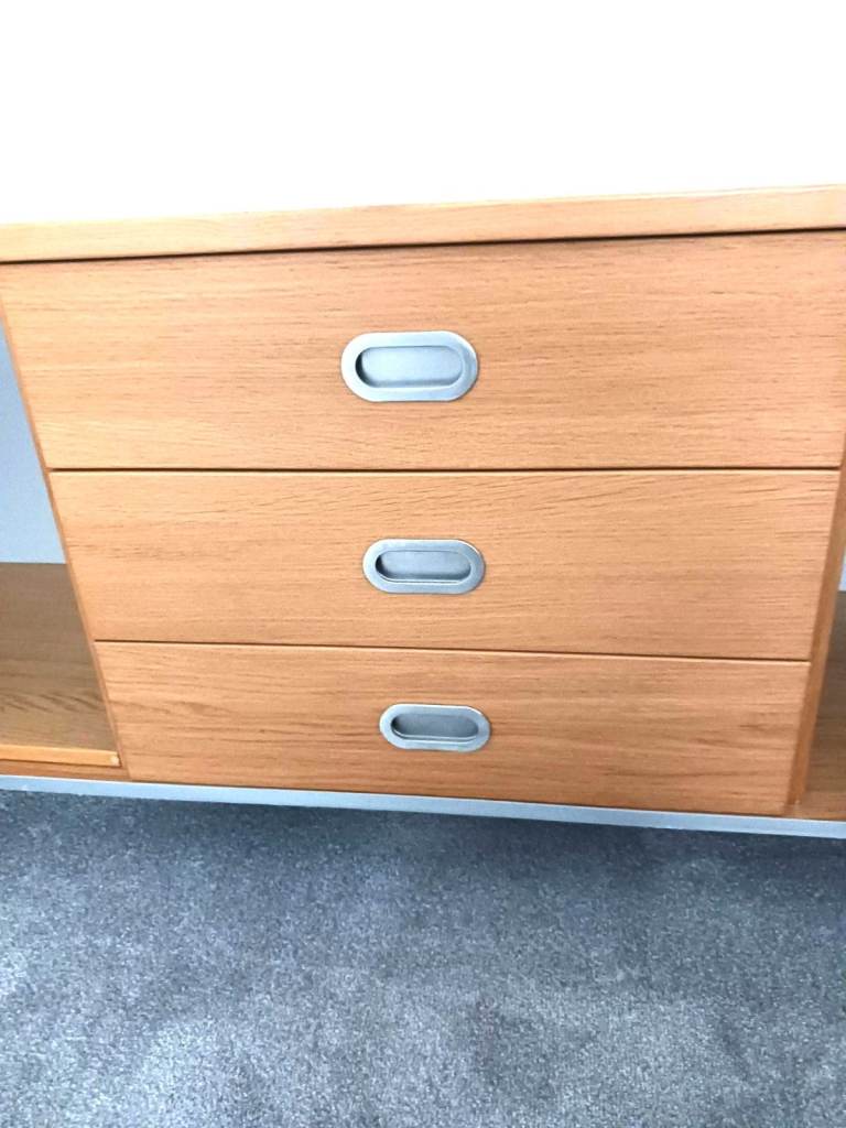Gorgeous low sideboard, width 191.5 cm / 75.5 in, height from floor 63 cm / 25 in, depth 44 cm / 17 in. Middle section is 3 drawers, left and right sections are both hinged doors, each side compartment has 1 shelf of adjustable height (or you could have 2 shelves one side and none the other). It has 5 legs, 1 each corner and 1 in the middle for extra strength. This is an IKEA Amiral sideboard (these items are no longer stocked), very good quality. We have the original IKEA instructions in case you want to dis-assemble then re-assemble. It's quite heavy and will take 2 people to move. Unfortunately we can't assist and you would need to carry out from our downstairs lounge. Light oak effect wood with brushed steel trim to sides, bottom and recessed handles. In photos 3 and 5 the the shelf on the left section is not in place but we have the shelf and the fixing pins. Collection only from Bedlington, South East Northumberland.