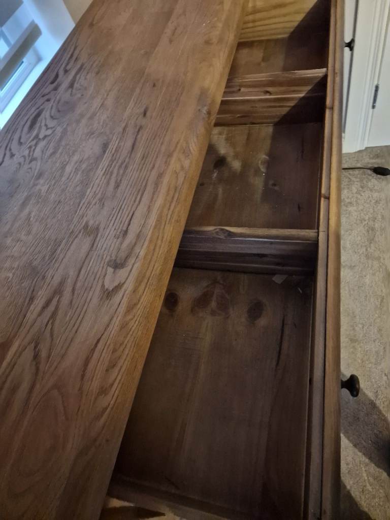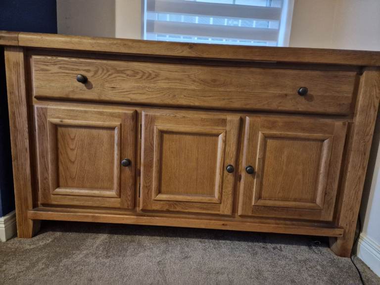 This is a well made solid oak sideboard in. Great condition. It is lovely as it is or someone might sanding and varnishing it.