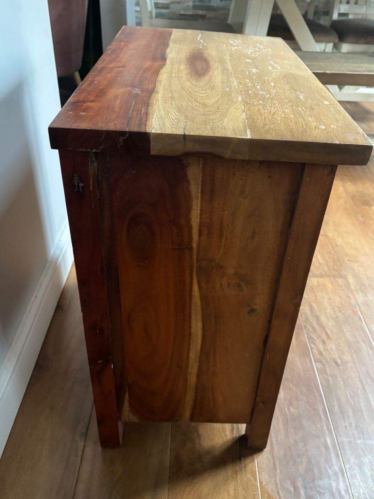 Lovely solid wood cabinet with 9 drawers, ideal for a hallway, living room, bedroom or home office. Great amount of storage while still compact. Natural wood grain and warm tones give it a rustic / boho look.