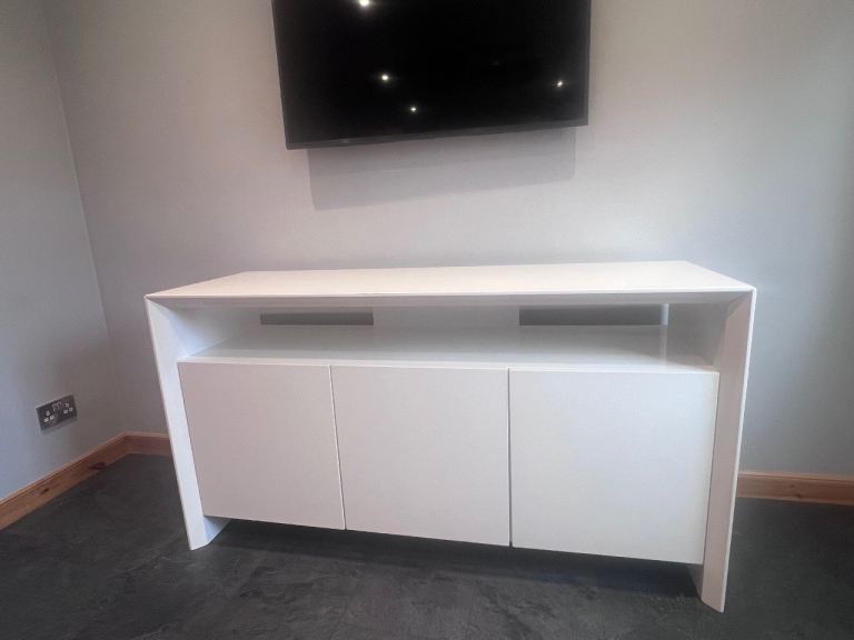 White gloss sideboard from Sterling, cost over £1,500 new. Size 150cm wide x 50cm depth x 81cm high. 3 cupboards with 2 shelves in each providing excellent storage. Really good condition. Buyer must collect.