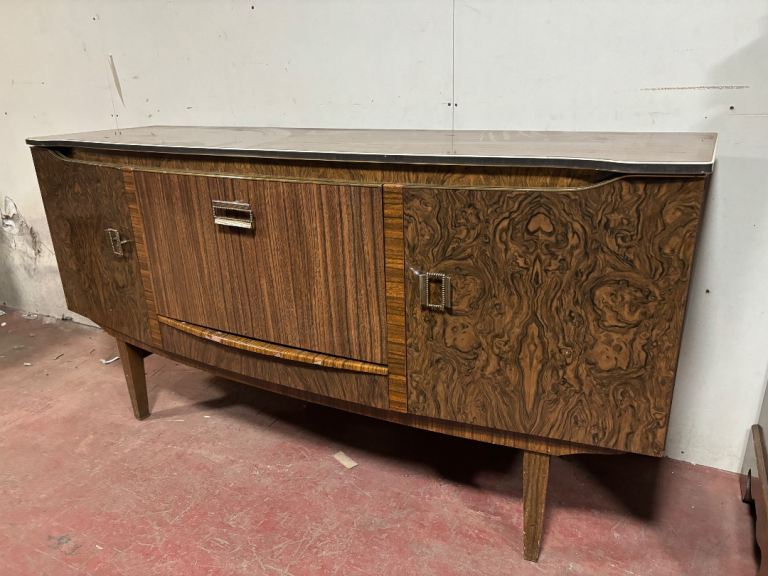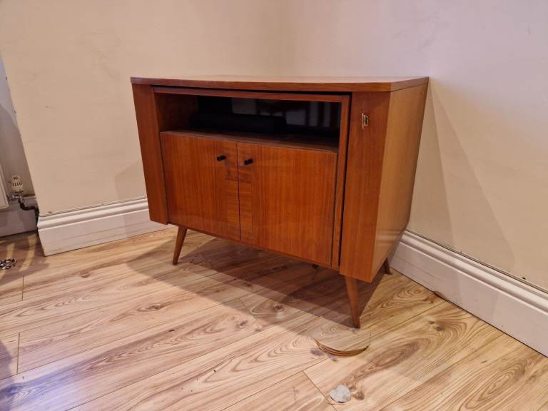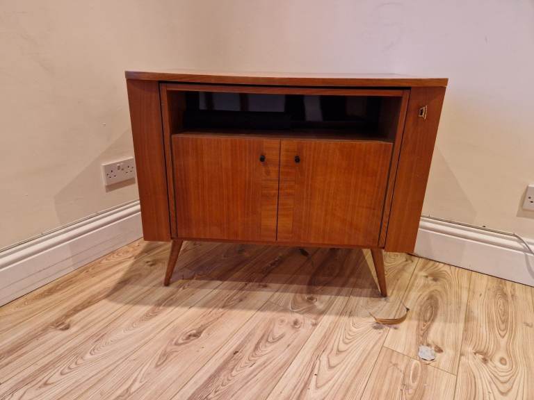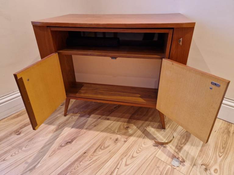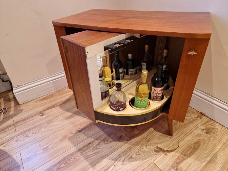 Exceptional original mid-century wooden bar cabinet from the 1950s/60s with a concealed, rotating drinks cabinet. At first glance, it appears to be a classic storage unit — but turn the key, rotate the interior cabinet 180 degrees, and a fully fitted vintage bar is revealed.