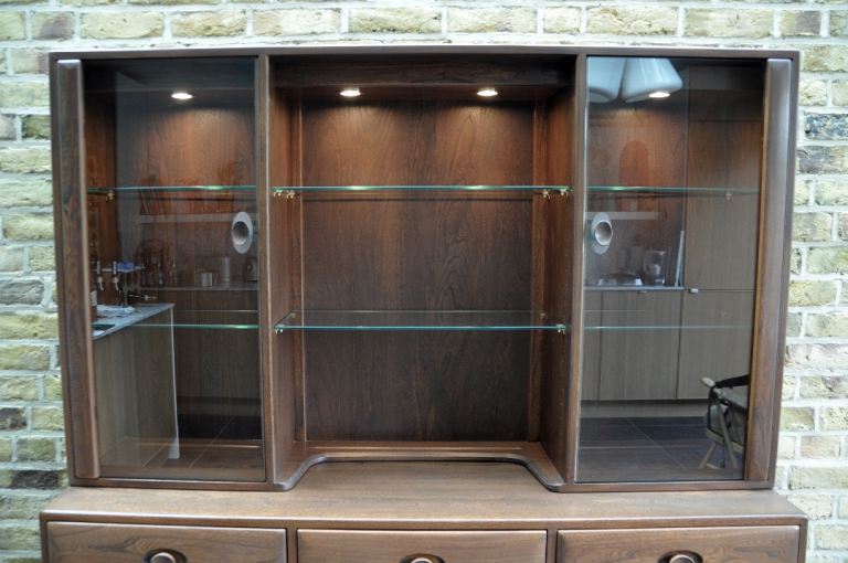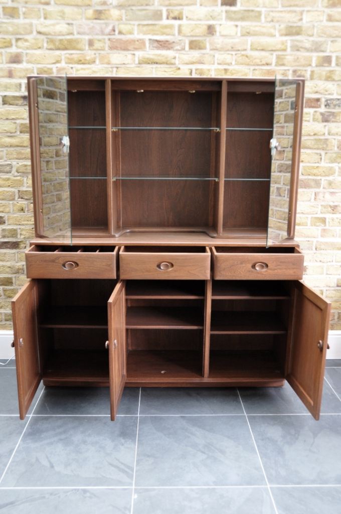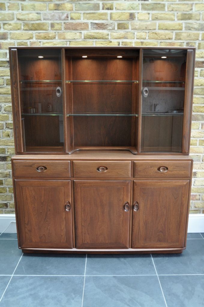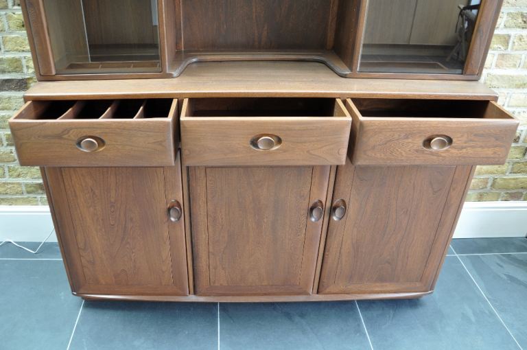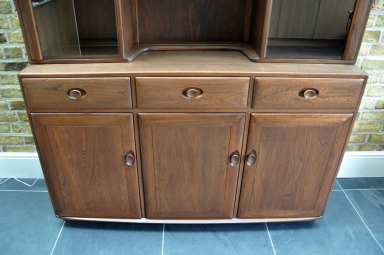 For sale Ercol Windsor Display Cabinet compromising a three door sideboard (model 3822 H) and glazed display top (model 3852).