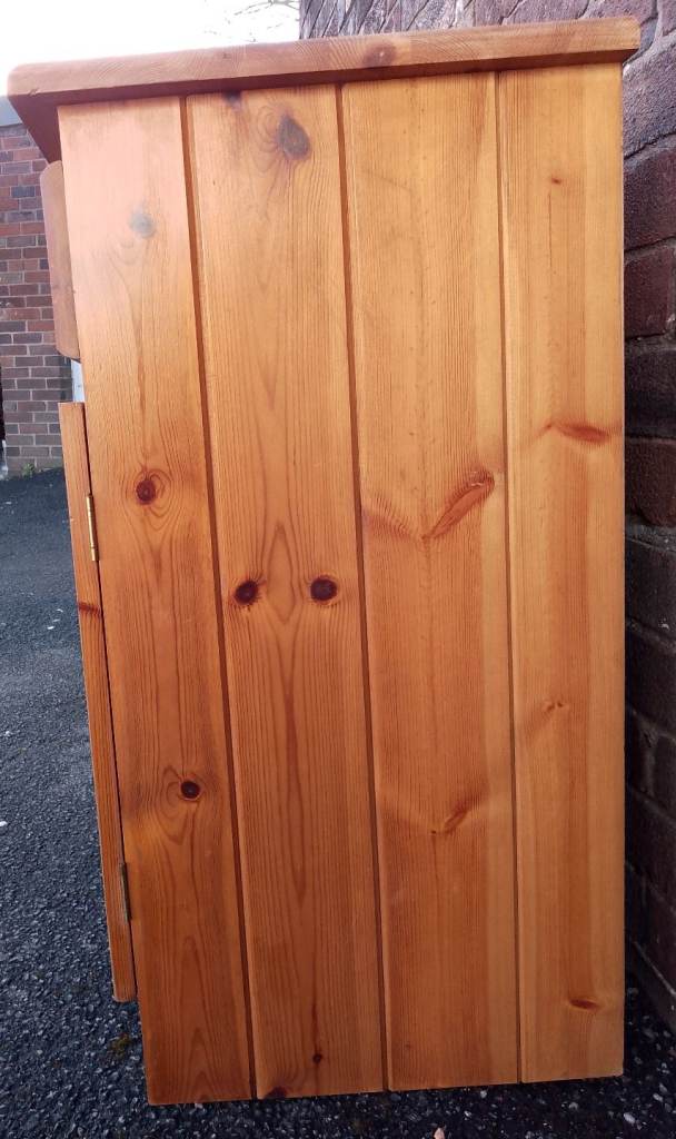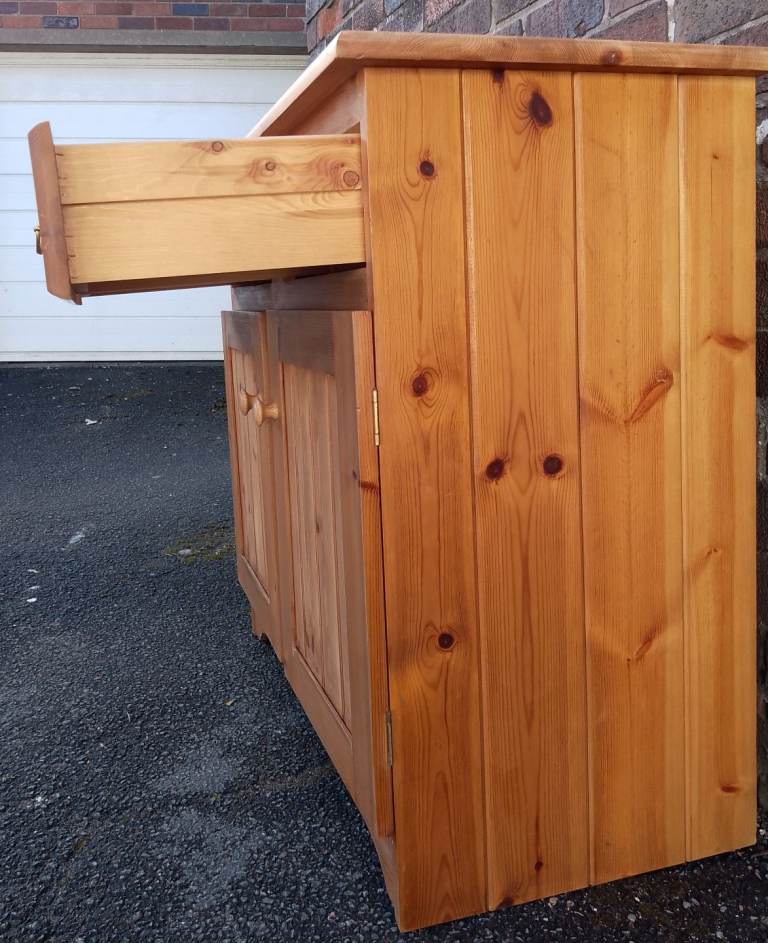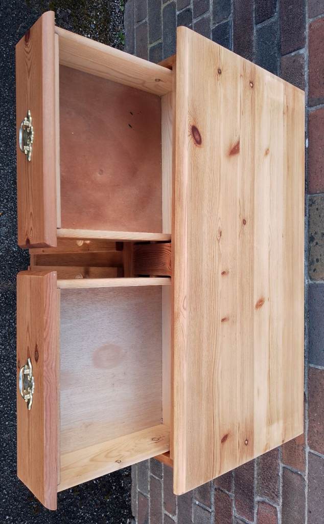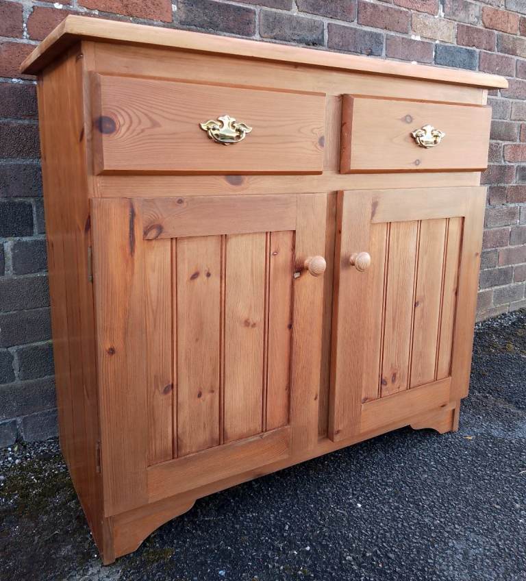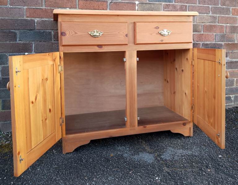 Good clean condition, antique pine stained with a natural sanded top. Two drawers with solid brass handles, good sized cupboard space below. All wood, no chipboard. 45cm deep, 91cm wide, 84cm high. Local delivery is available for a charge.