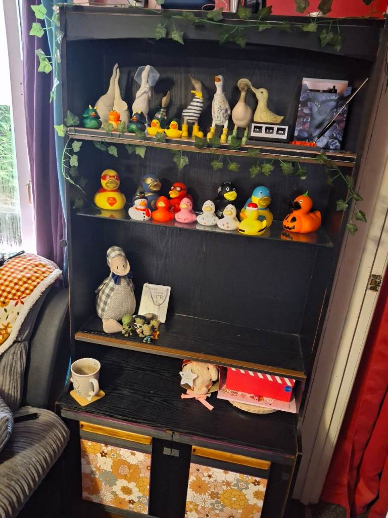 Solid and sturdy, covered in black woodgrain fablon, black trims. Can easily be peeled and removed. 2 glass shelves, 1 wooden shelf..small hole in backboard, Well looked after just need the space