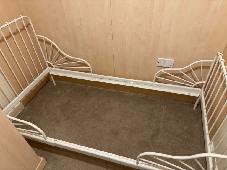 IKEA Minnen bed frames. They adjust and grow with your children up to a full size single bed. Both are used with a bit of wear and tear but still fully functioning. We’ve got the slats to go with them. Also available is an excellent IKEA 3 piece mattress to go with one of the beds which is available for an additional £30. Happy to sell frames as a pair or £25 for 1. You can get a whole bed-frame, slats and mattress for £55. Cost when new would be £215.