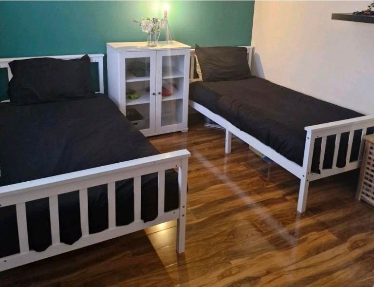 Posting for under a month2 x single white wooden bed frames