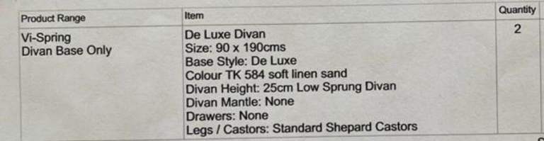 Description and measurements in the last photo. Great condition, only selling as we are buying a new larger base. Only selling the divan, not the mattresses.