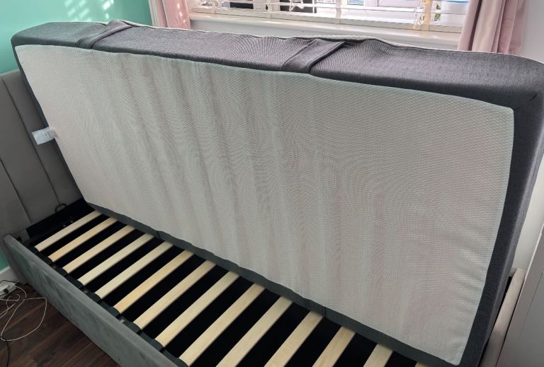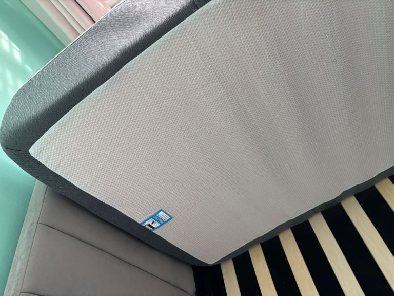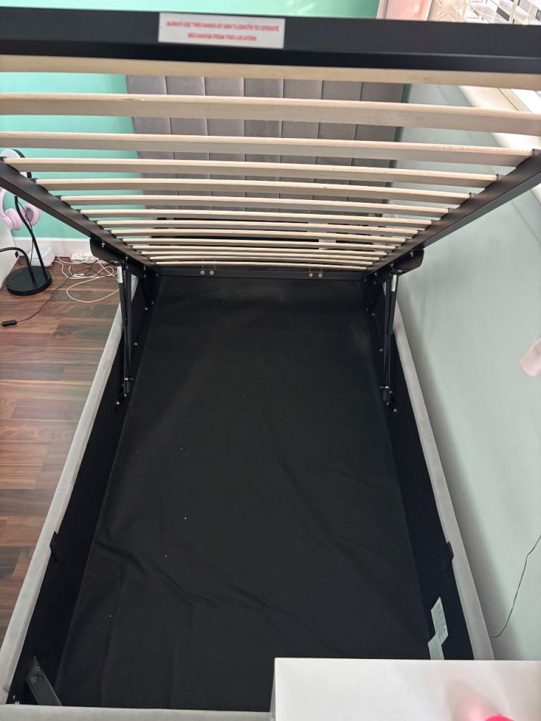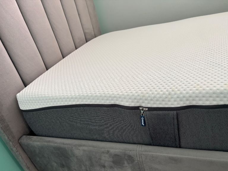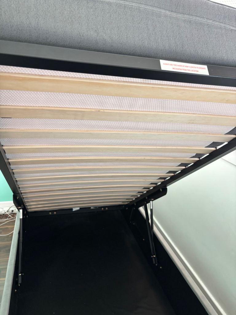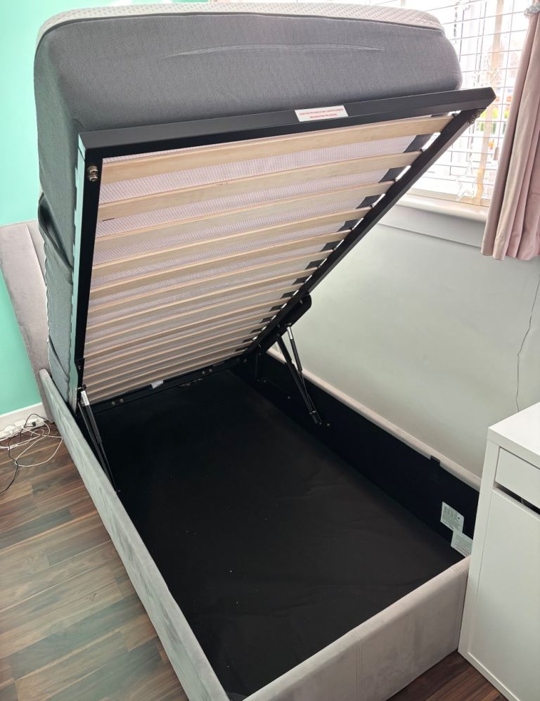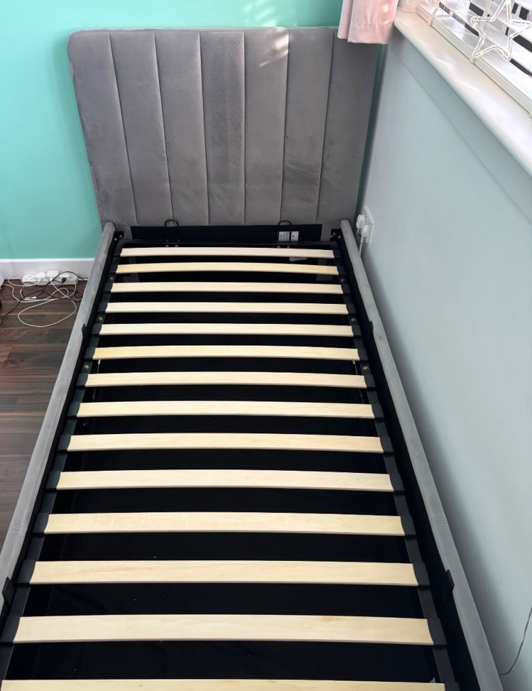 Grey velvet ottoman bed, size single, end lift, RRP £325 at Argos and Emma single mattress, RRP £250 both great condition. Collection only.