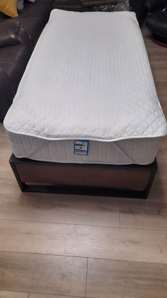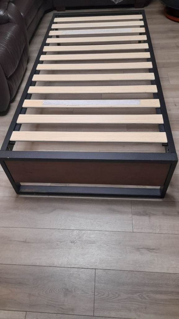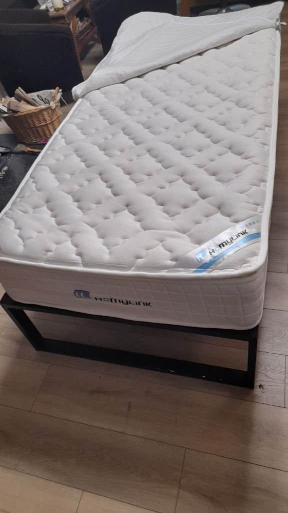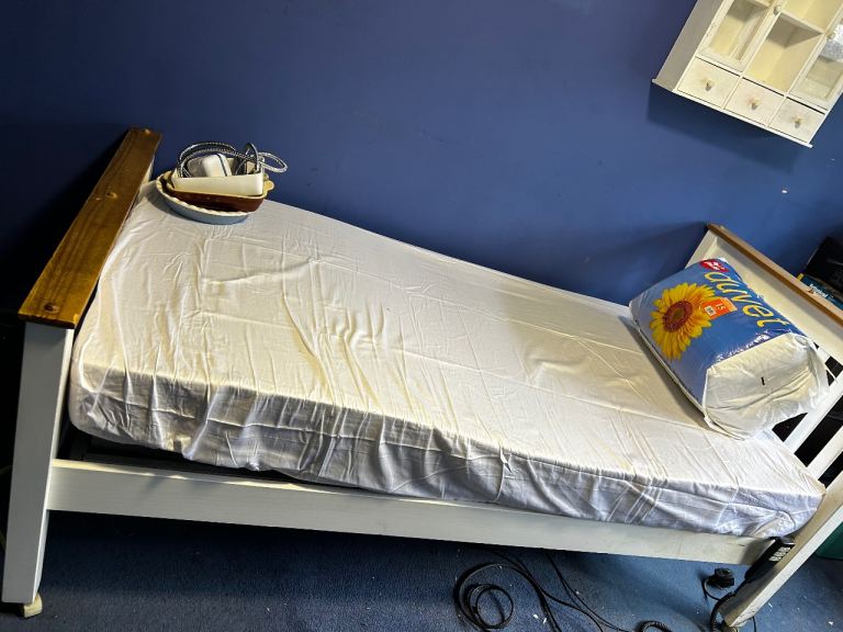 Almost new quality single bed almost unused, from guest room. No stain mattress, topper protector and very sturdy bed frame. No wobbling and squeaking. Bargain price for £150. With confidence first who will view will buy it. Can deliver with small fee. Thank you.