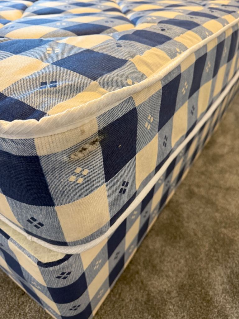 There is small damage on the mattress that were accrued during delivery. See pictures