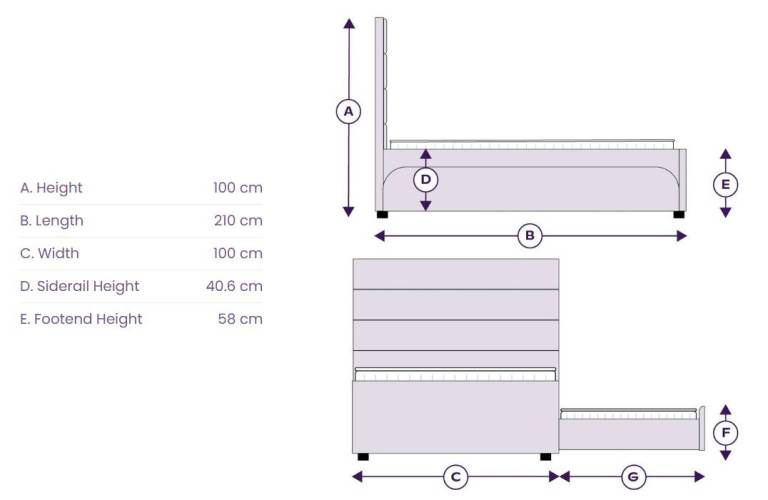 Dimensions : W99cm X L210cm. Headend height 100cm, footend height 58cm. Guest bed height when pulled out 25cm, guest bed width 100cm.