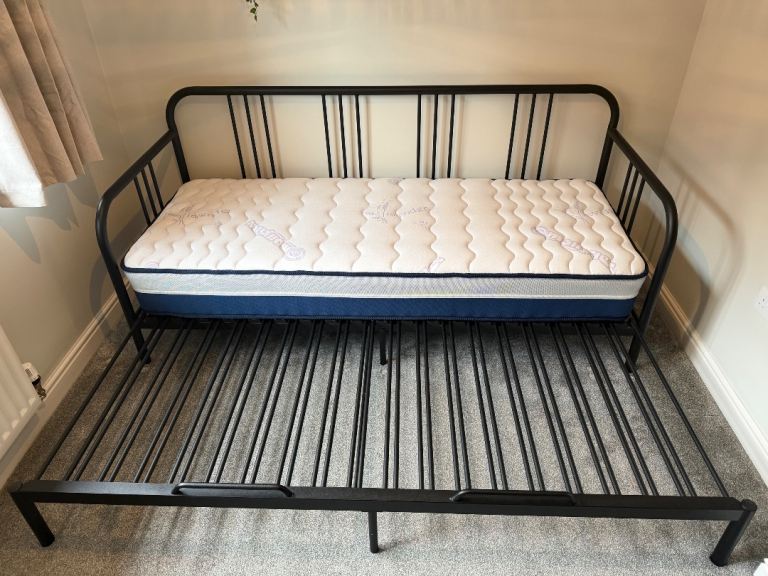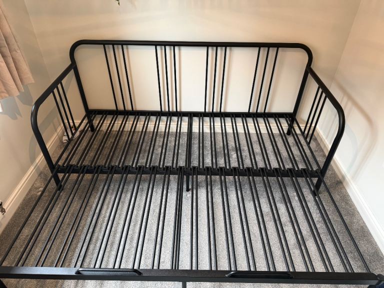 Black Ikea Fyresdal metal day bed. Like new condition. 80 x 200 Mattress included. Mattress has been slept on a few times but has always had a mattress protector on so is in like new condition, no marks or stains. The day bed can be used a single or pulled out to make a double. Additional mattresses can be purchased from ikea or Amazon. Dimensions on the last picture. Can be dismantled. COLLECTION ONLY.