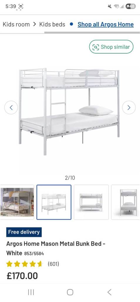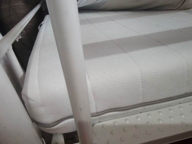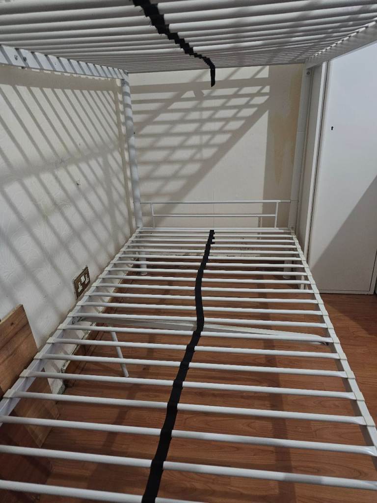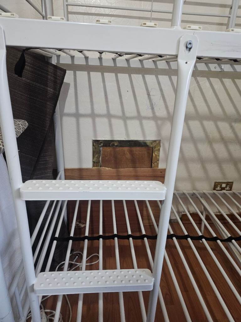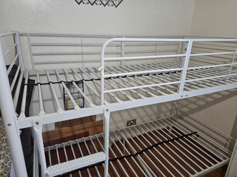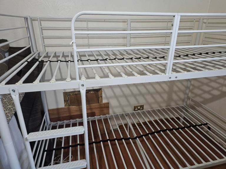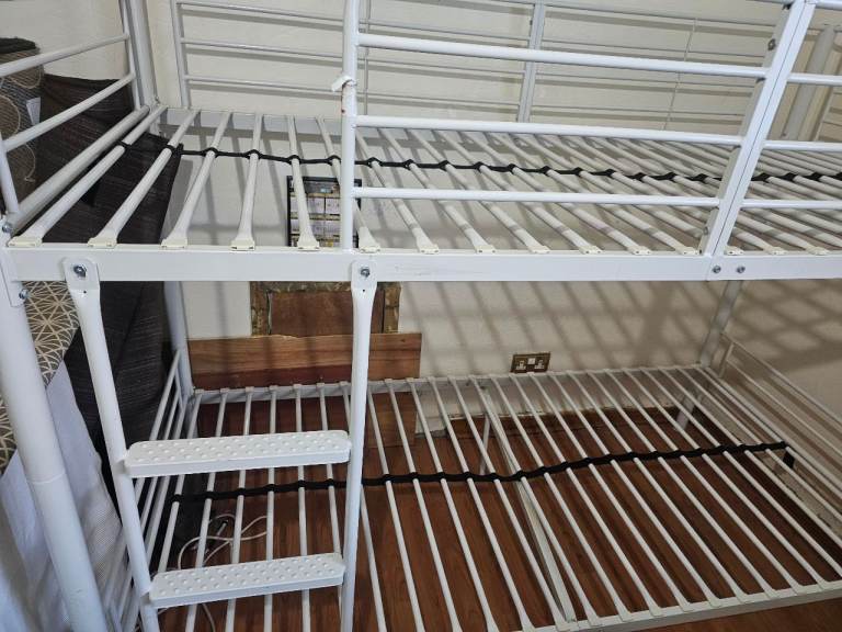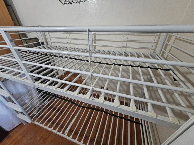 The white metal bunk bed is being sold as seen. It is In good condition, selling 2 Mattresses with the bunk bed.