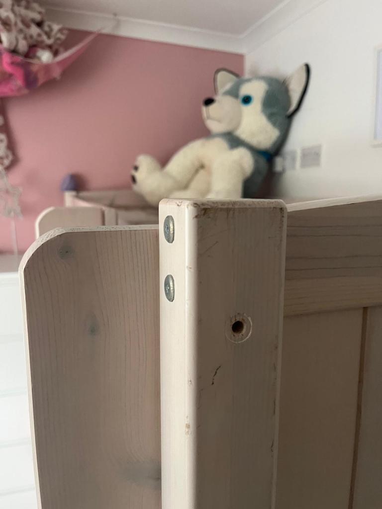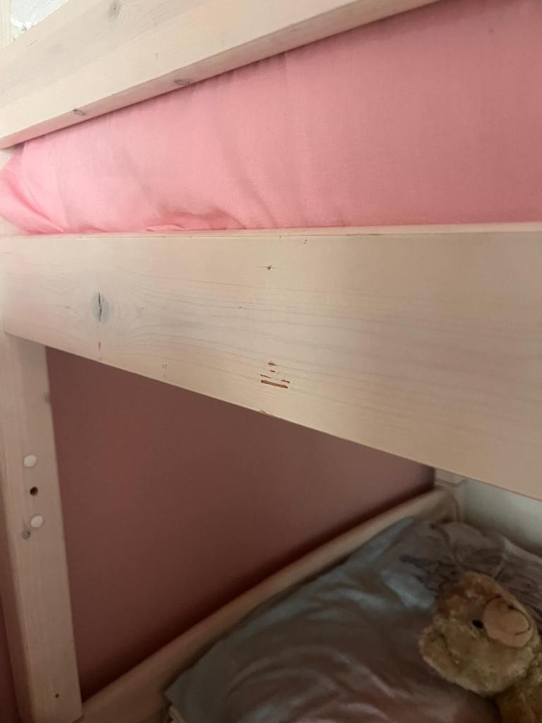 Bunk beds with 2 single mattresses one also has a foam mattress topper. From a smoke free home. Ladders are strong and sturdy. Nothing is broken just some marks from being used. Please note bedding and teddies aren’t included.