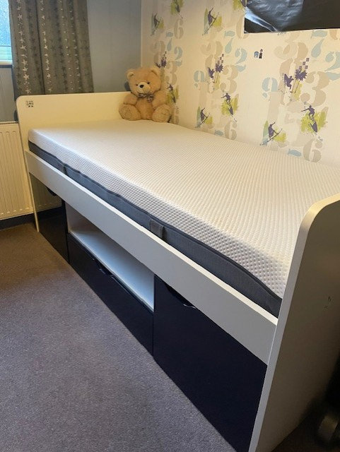 For sale - Cabin bed in excellent condition, with two roomy built-in cupboards for storing toys, a spacious drawer for bed linen and a handy shelf for prizes possessions - all tucked neatly under a full-sized single bed - this children's cabin bed offers plenty of storage for your child's needs.
