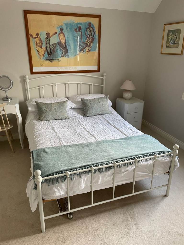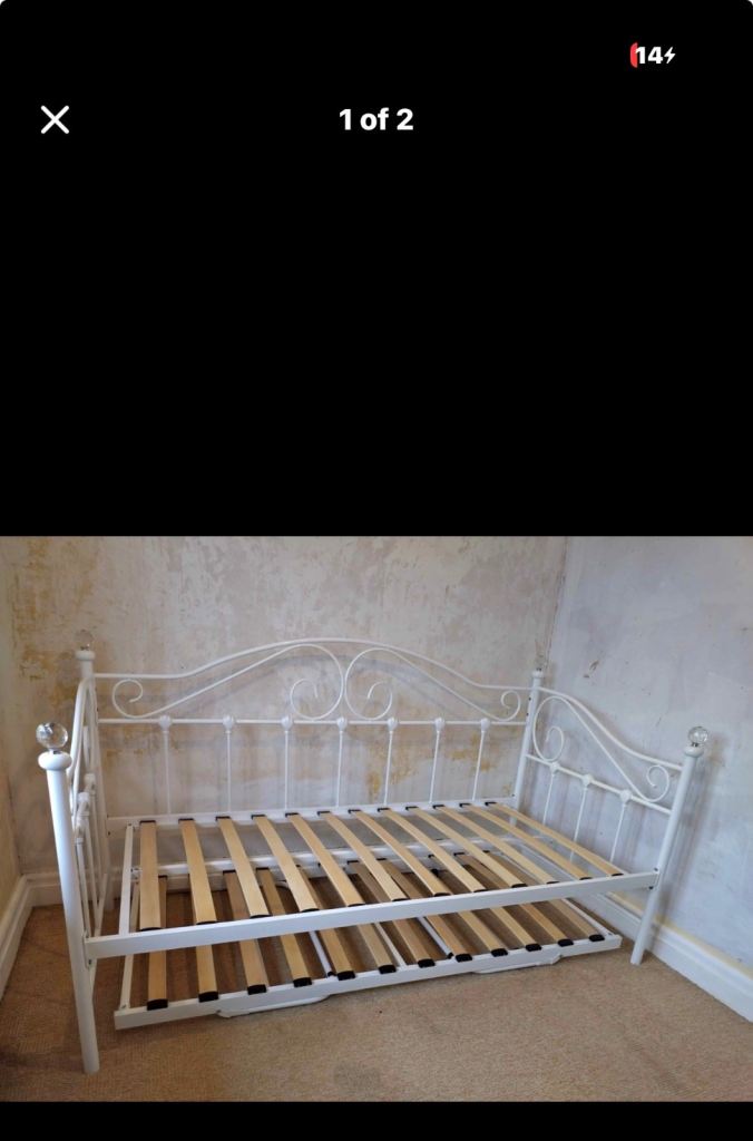 Lovely white metal day bed with a pull-out trundle bed underneath, perfect for guests.
