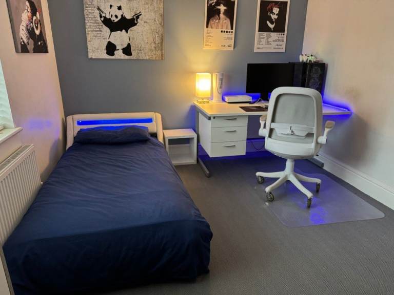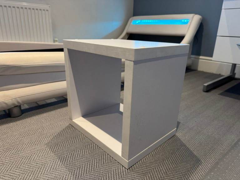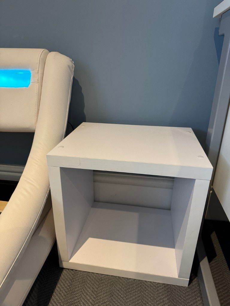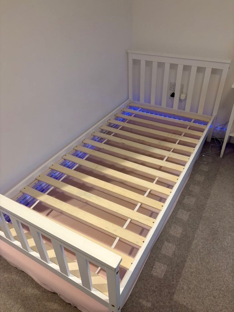 Single bed (perfect for kids/teenagers) with LED headboard (8 different colours), high quality 800 pocket sprung 8"/20cm thick mattress with memory foam topper and white cube bedside table.