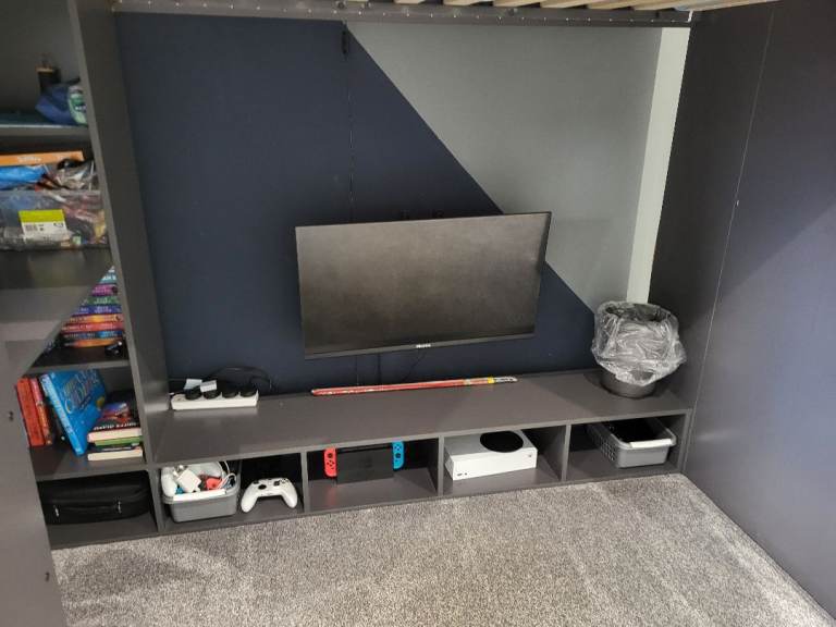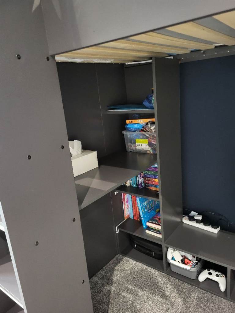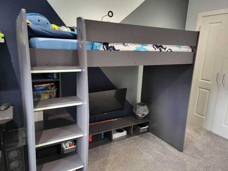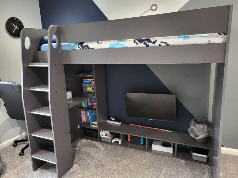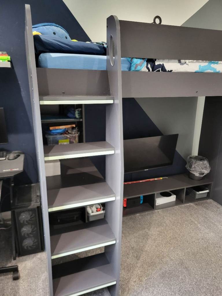High sleeper single gaming bed. Grey. Lots of shelving and ways to hide wires. Also glow in the dar strips on ladders. Collection from Hamilton only. Will be dismantled. Still selling for £400-500 online.