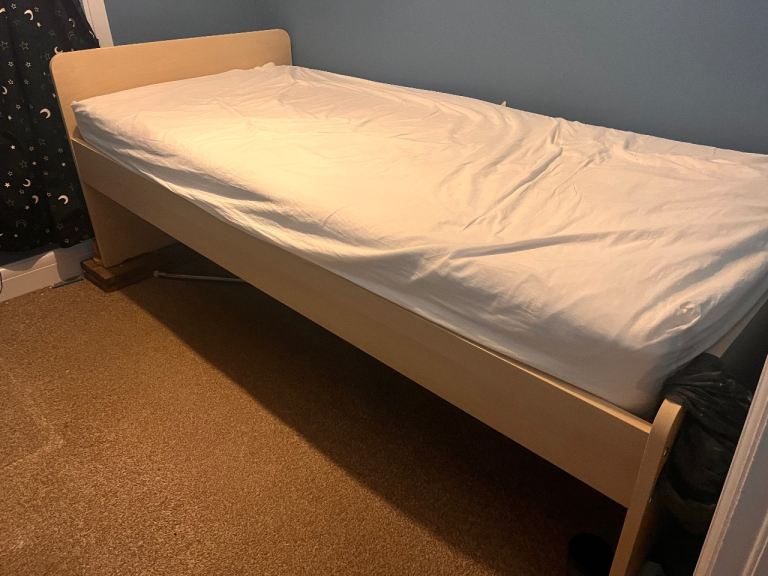 Ikea pale wood bed (matress not included) 3under bed storage units (the wheel came lose in one so has been reinforced-please see pics)