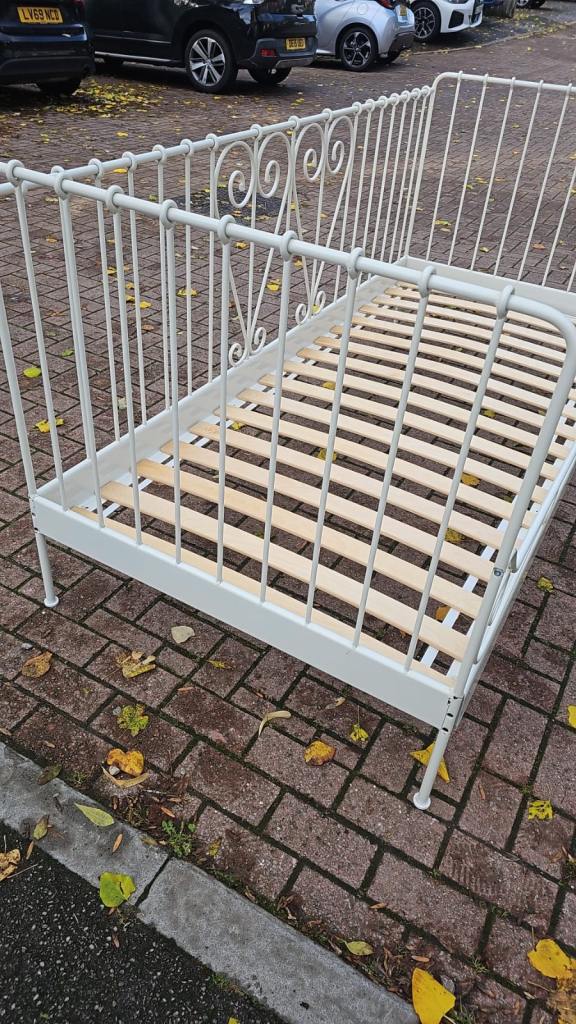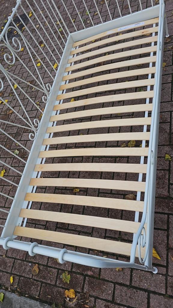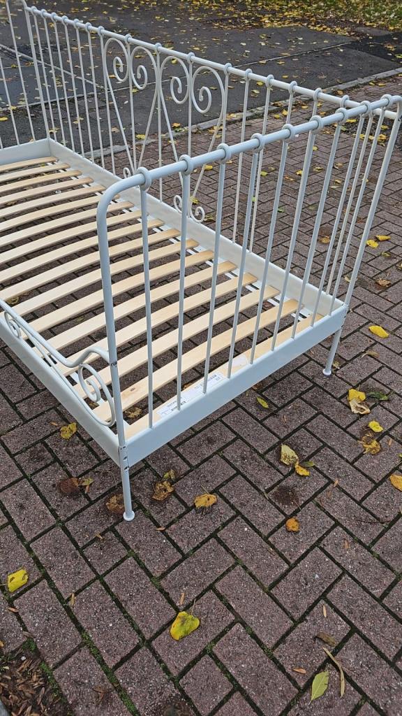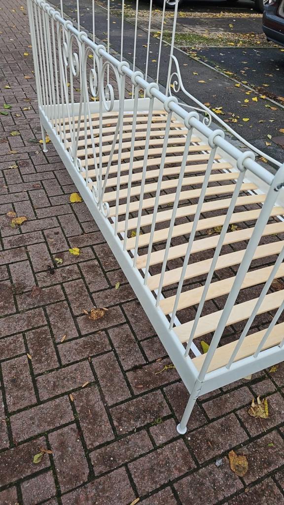 Ikea white single day bed it’s in good clean sturdy condition odd light wear mark but no damage or missing pieces. The frame is 96 cms wide and 205 cms long fits a standard single mattress. Collection is from Malpas Newport np20
