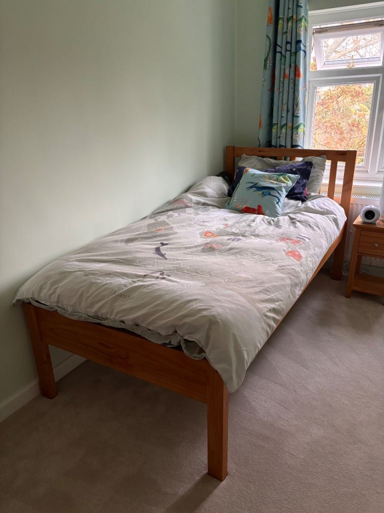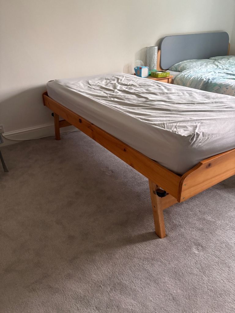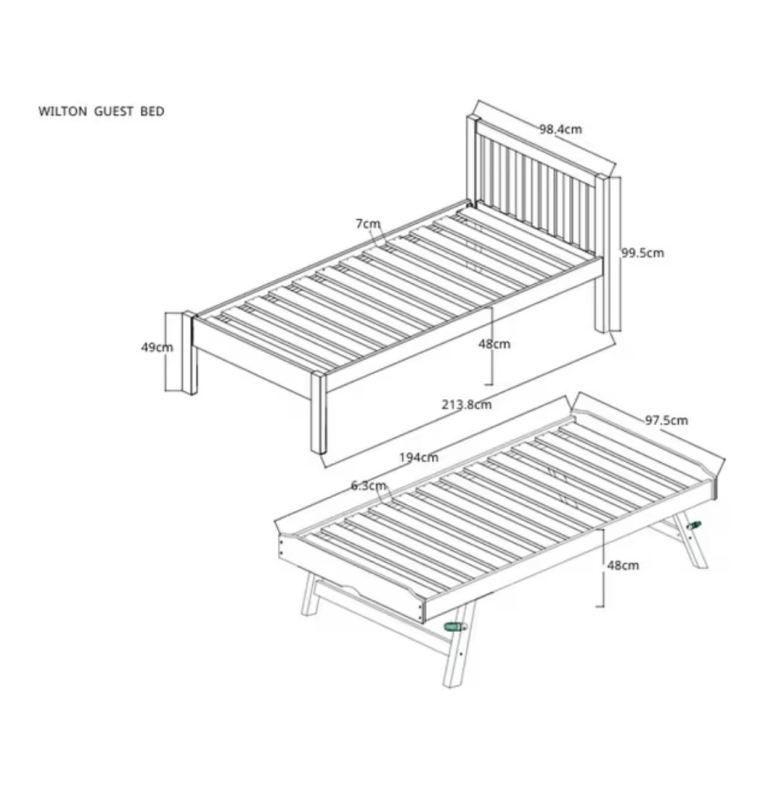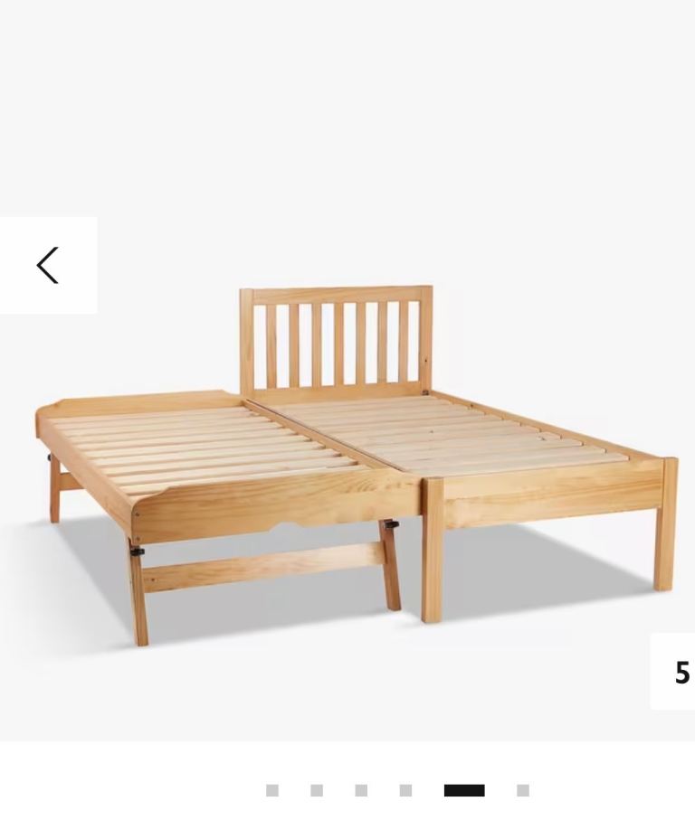 John Lewis trundle beds with one single mattress. The lower bed can be lifted up on its own legs to be the same height as the upper bed. Mattress is good quality and in excellent condition. Non-smoking and pet free home. There are a few minor wear and tear marks at the base of the legs but they aren’t really noticeable. The lower bed also takes a regular size single mattress.