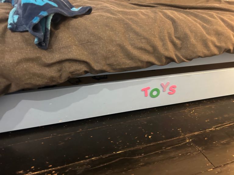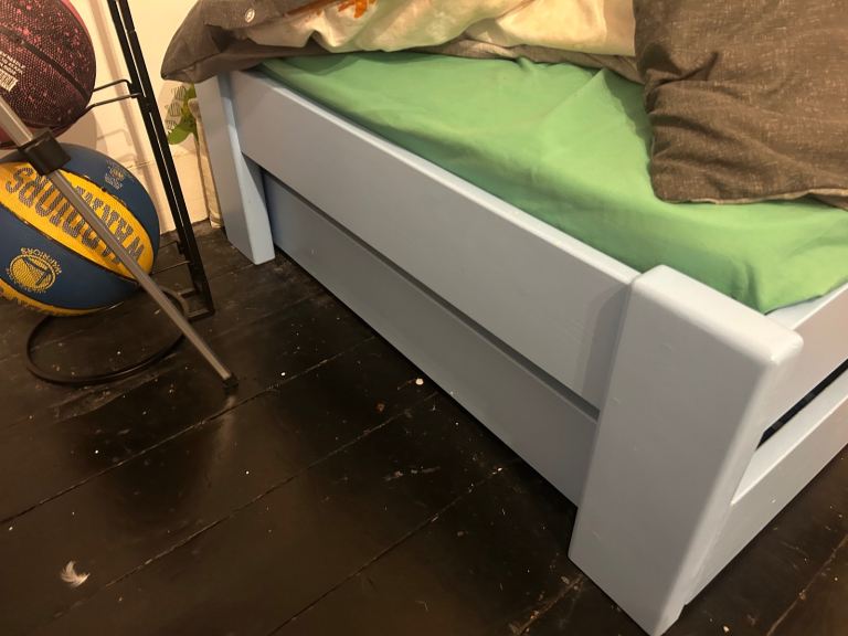 Light blue hard wood bed. Scandi design - the bed has no screws or nails just fits together. Storage underneath runs the length of the bed and is on wheels. Excellent, sturdy design. Originally, the bed with tent cover was £1000.