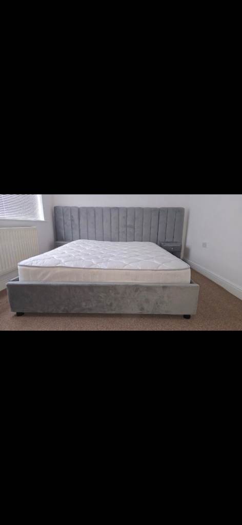 Grey Kingsize bed with mattress and 2 bedside tables attached to the headboard excellent condition, only 6 months old
