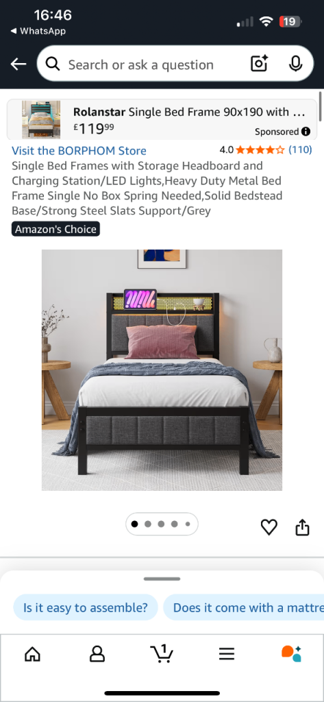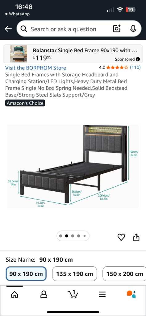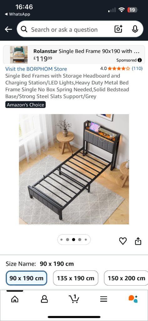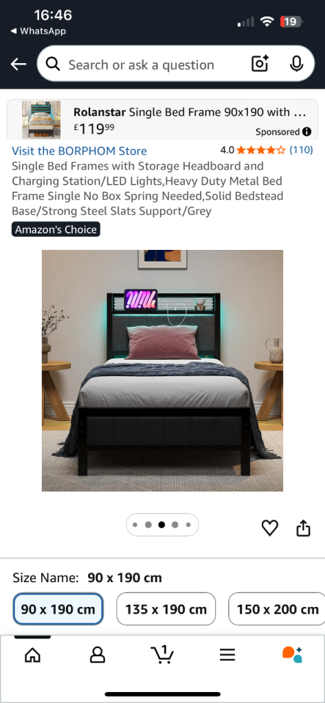 Modern metal bed frame in excellent condition, only bought in December, so still quite new. Features a stylish headboard with LED lighting, built-in shelf, and charging ports, perfect for phones, tablets, or a night light.