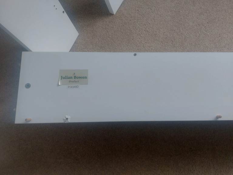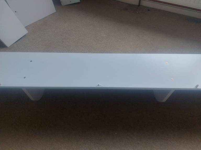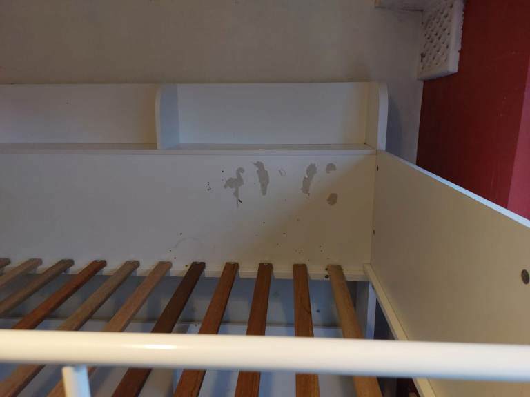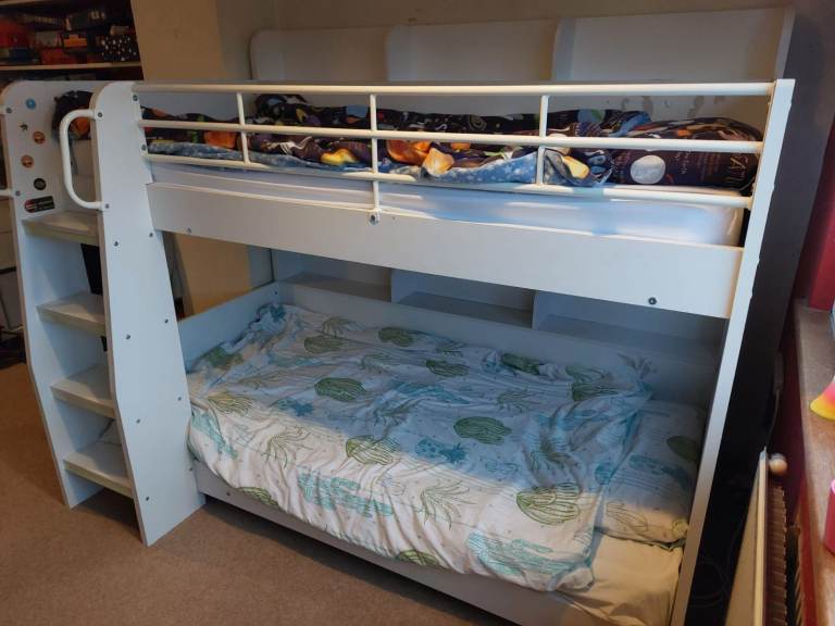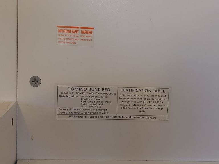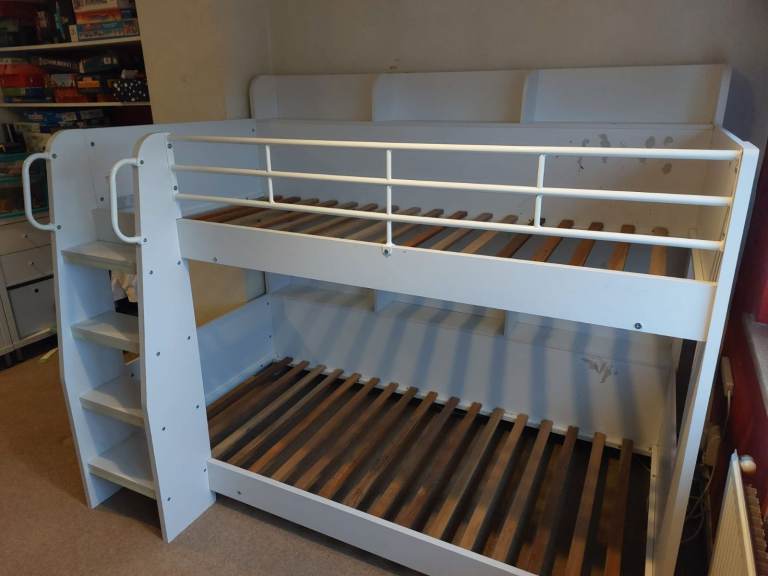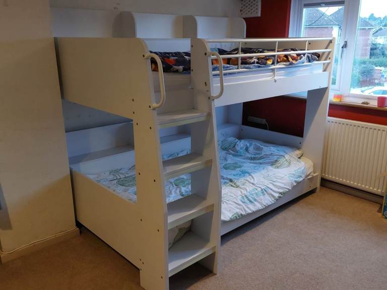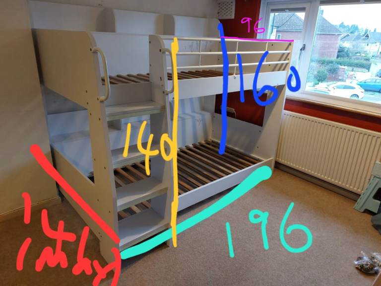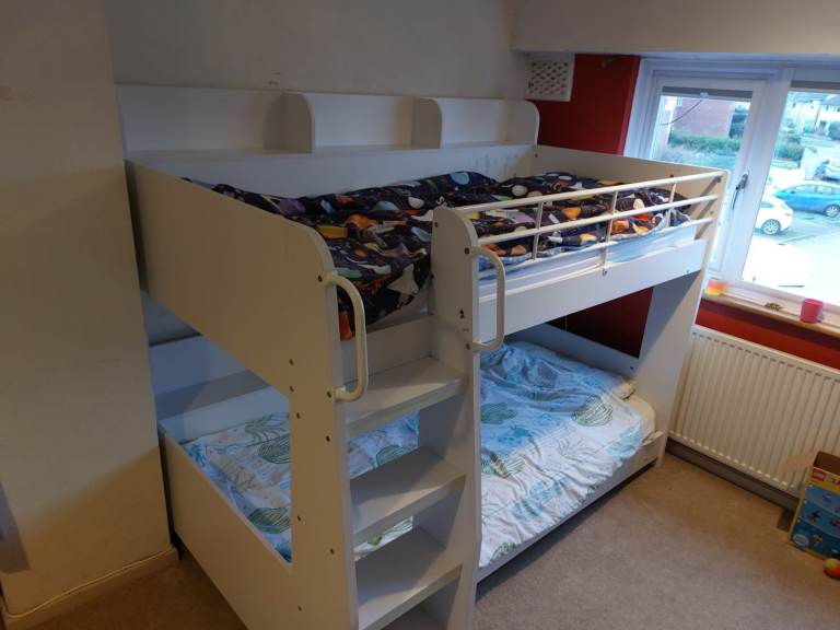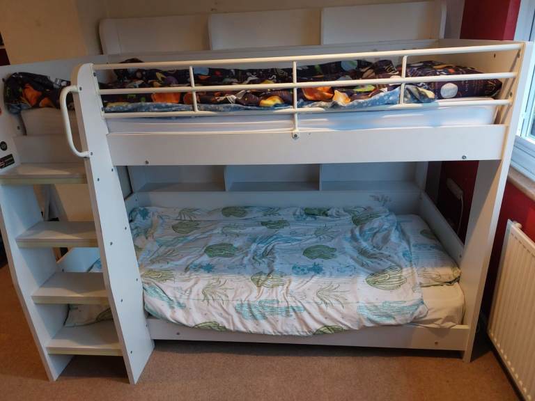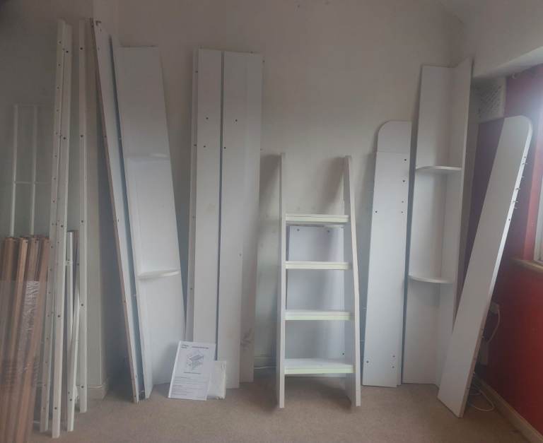 This bunk bed has been great for our son as he has grown up. It is really sturdy and spacious, but also comfy and cosy, and has been ideal when having friends over to stay. The integrated shelving is great for books/bedside lamp/alarm clock/cuddlies etc., and the steps are so much better than a ladder. It's suitable for standard-sized single mattresses, and we can offer one clean mattress with the bed (the bedding is not included). Printed intructions are included, and all parts and fixings have been checked and accounted for (parts are numbered for ease of assembly). There are a few cosmetic imperfections where stickers have removed the white surface (see in the photo e.g. the mark from a flamingo-shaped sticker!). Also see in the photos slight damage on one of the shelving units as we were disassembling. This is on a face that isn't visible when the bed is assembled and has been glued, so shouldn't affect structural integrity (but hence the low price). This is a really substantial bed and will probably need a van for collection from Botley, Oxford (we're not able to deliver).