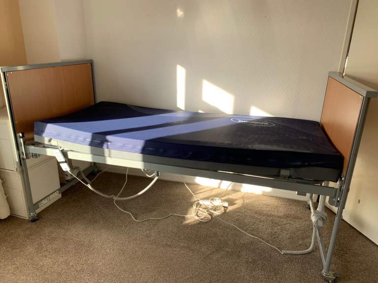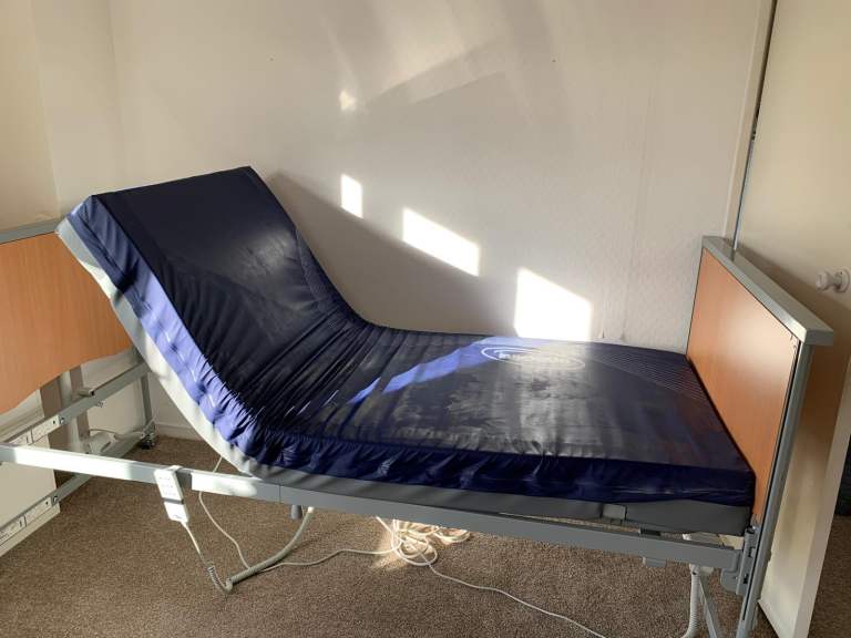 Fully height adjustable ‘hospital’ style bed with four section mattress which enables comfort and reduces risk of pressure sores. Bed raises to various heights and angles for individual positioning and ease of use.