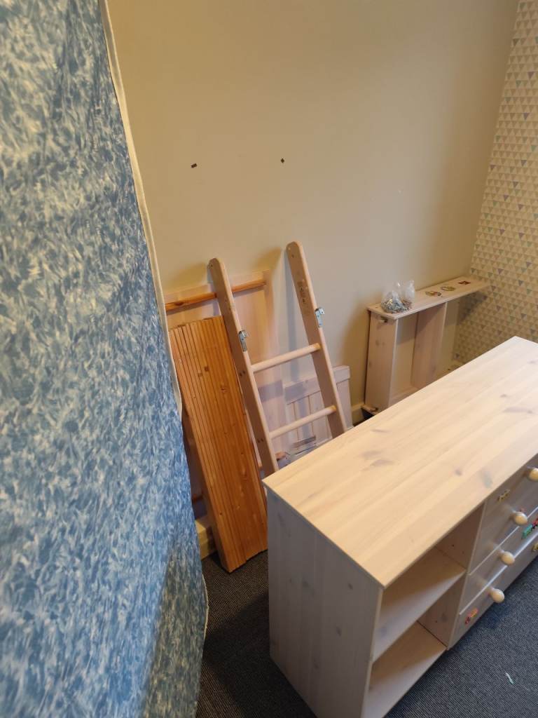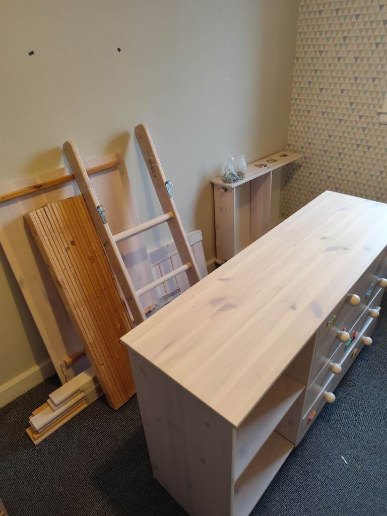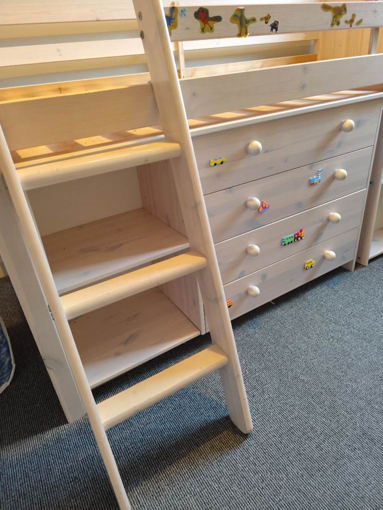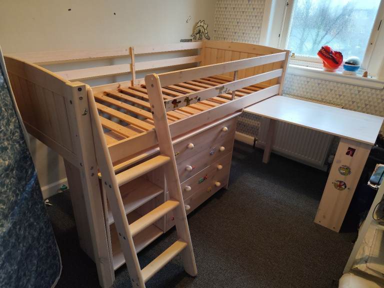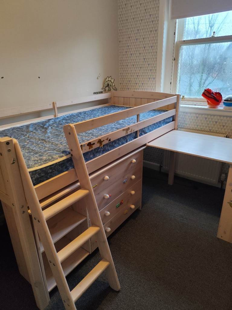 Posting for 13+ yearsMid sleeper bed with chest of drawers, desk, shelves and mattress