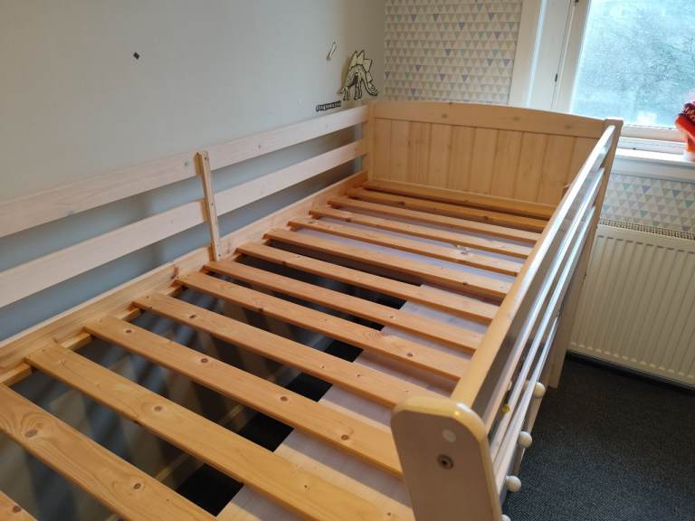 Single mid sleeper with pull out desk, shelves and chest of drawers. Comes with mattress (Waterproof not used), can add mattress protector.