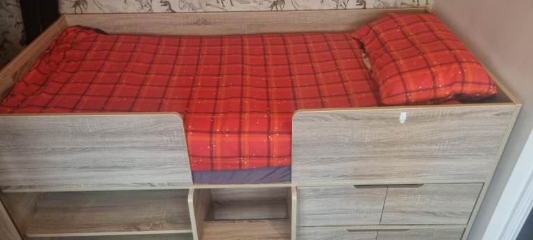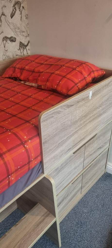 This single cabin bed was originally purchased from NEXT and is a great space saver featuring shelves, cupboard storage, and below bed storage/play space. This bed comes from a very clean and smoke free home and the bed has been very well looked after.