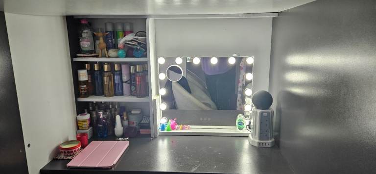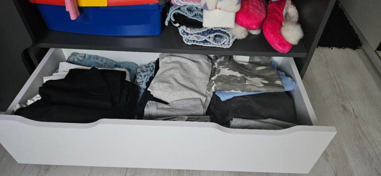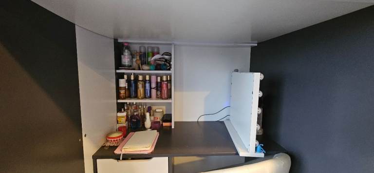 Great condition, just some wear on the desk as in photo. Have purposely kept all items on display to show how much storage options this bed provides. It is ideal for a small room or those needing plenty of storage. Contents, mirror, seat and mattress not included.