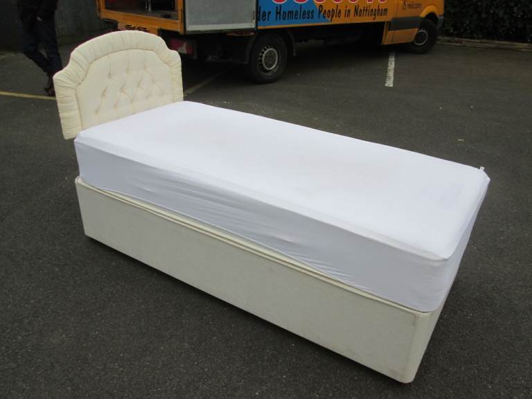 QUALITY SINGLE DIVAN BED (MATTRESS SLIGHTLY MARKED - COMES WITH COVER) at HAVEN TRUST CHARITY SHOP at 247 Radford Road, Hyson Green, NG7 5GU. Local delivery £10 - sent postcode to check. Shop open 10am-4.30pm Tuesday-Saturday. ALWAYS CHECK WE'RE AT THE SHOP BEFORE VISITING IN CASE WE'RE OUT ON A LOCAL DELIVERY - phone or message. Payment accepted in cash or by transfer.
