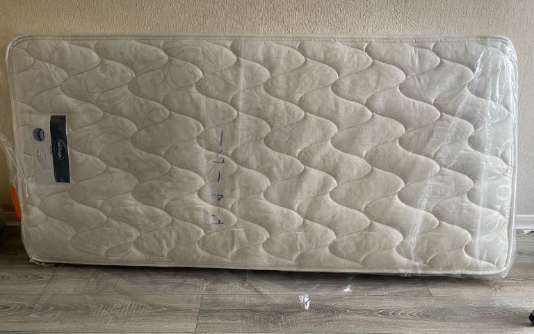 This Silentnight mattress is a firm, single-size box spring mattress designed for adult use in the bedroom. The white mattress measures 190 cm in length and 90 cm in width and features a fabric cover. It is part of the Silentnight Vilana Limited Edition Miracoil collection.