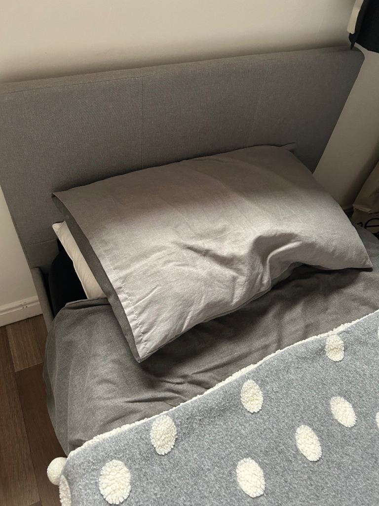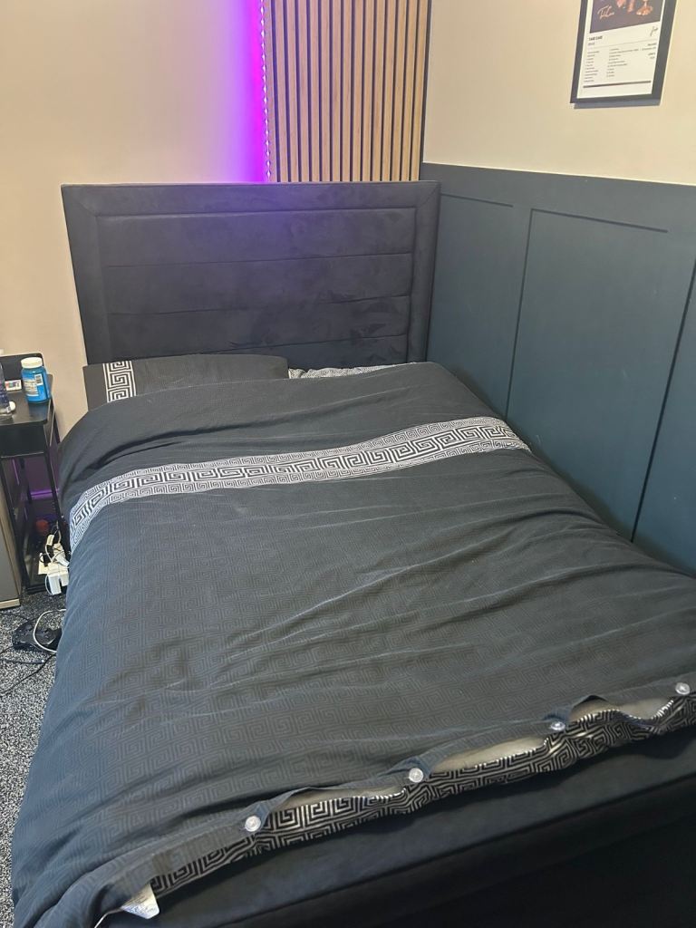 Metal single bed with mattress and grey headboard. Hardly been used as spare. Buyer to uplift . Bridge of Don