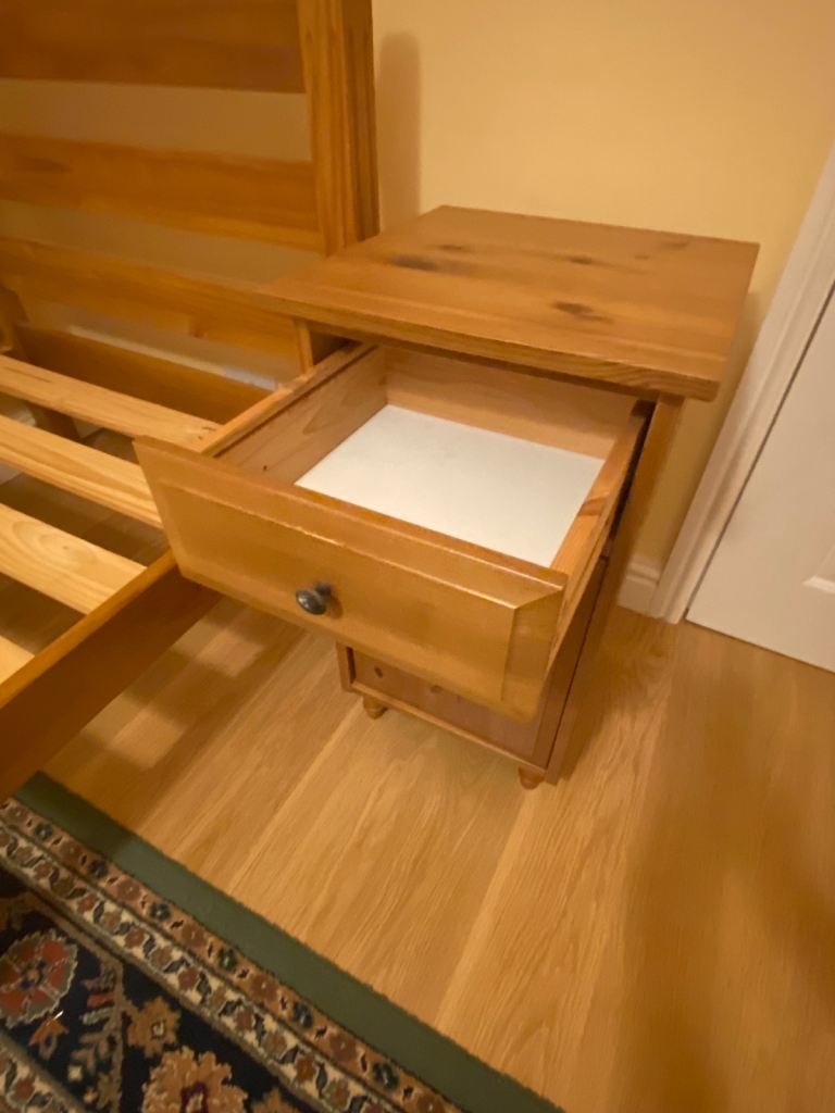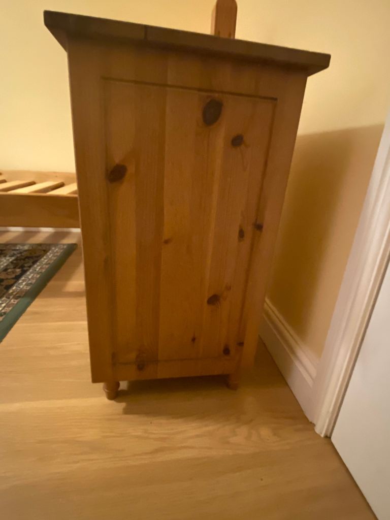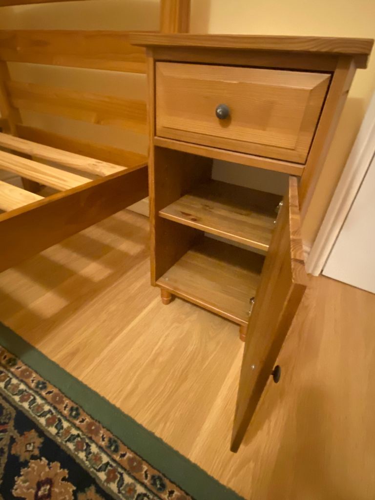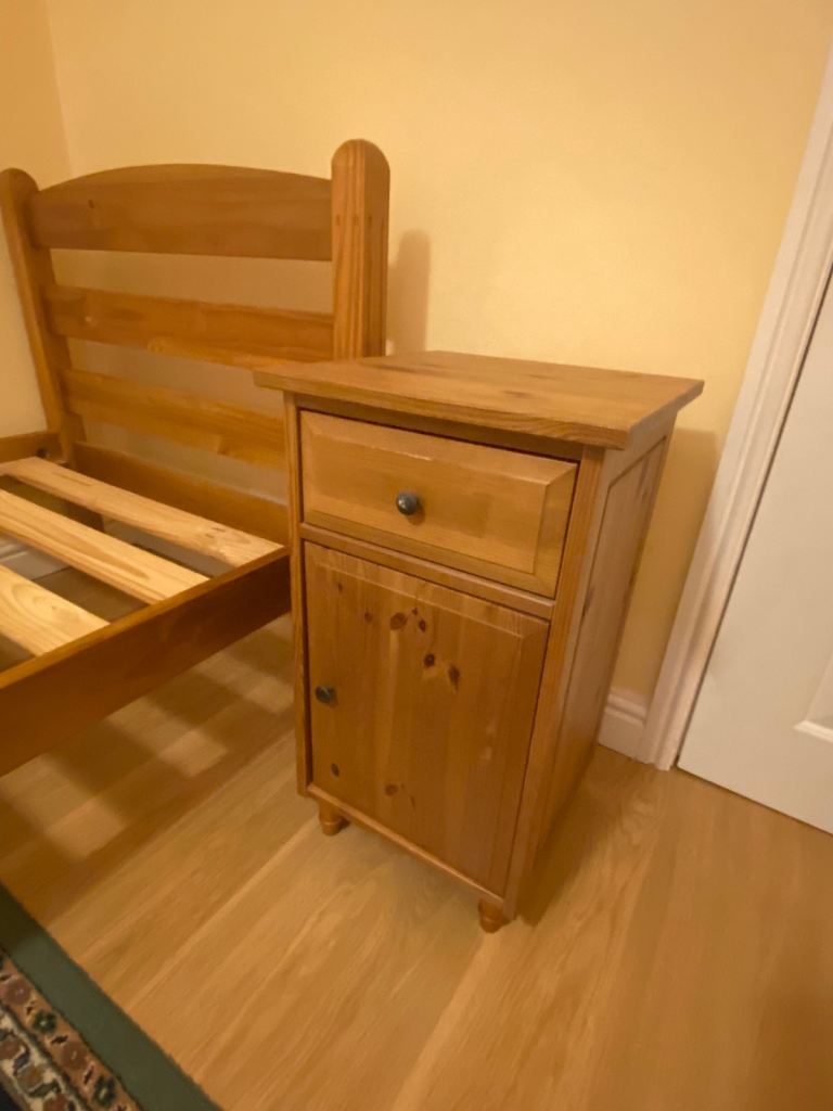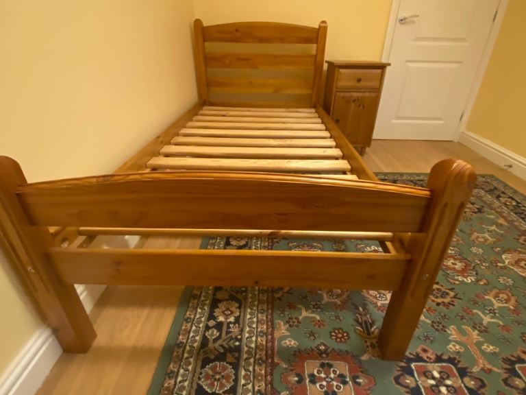 Solid dark pine single bed frame with slats. Overall measurements: L: 200 cm W: 100cm height floor to slats: 38 cm. Height of bedhead: 96 cm. Mattress fit: 190 x 90 cm (not included but available at IKEA, for example). Sold with matching bedside table H: 68 cm W:38.9 cm D: 38.9 cm.