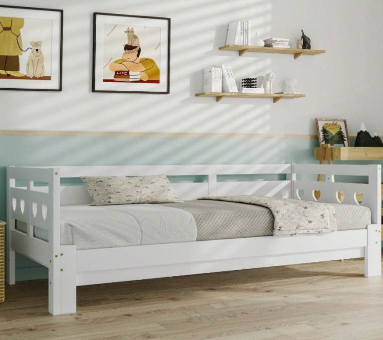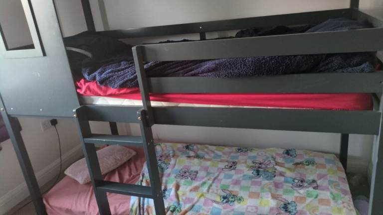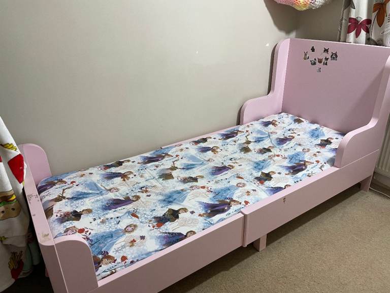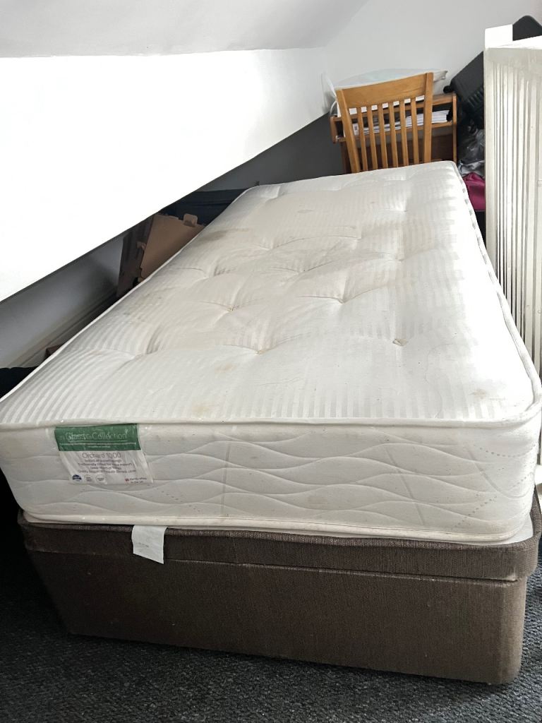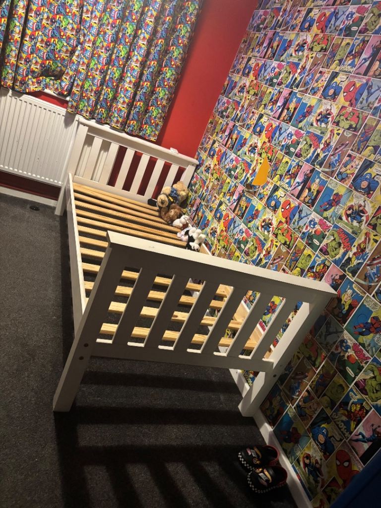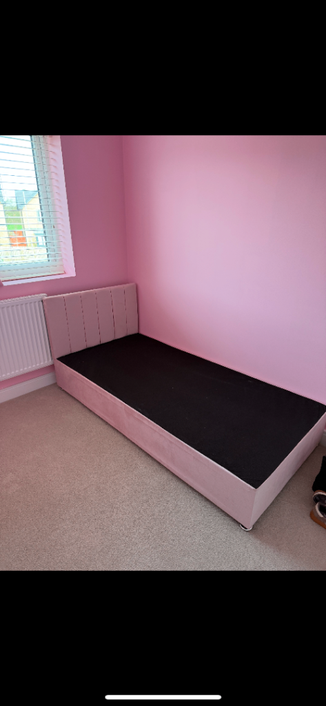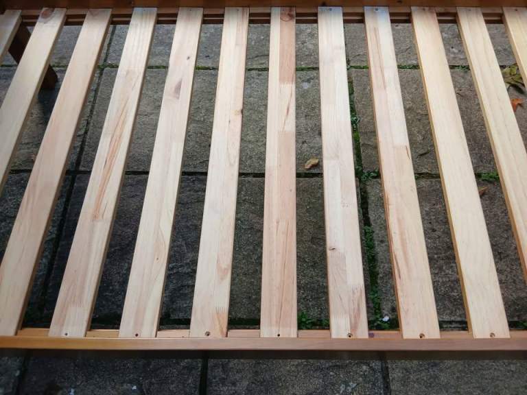 Solid chunky bedframe, accommodates standard UK size single mattress 90 x 190cm. All complete with fixings. The bed frame has been previously used.