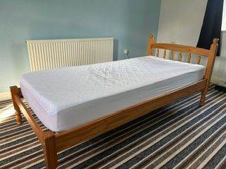 Single bed frame, solid pine wood, and unused mattress together, all complete, vgc