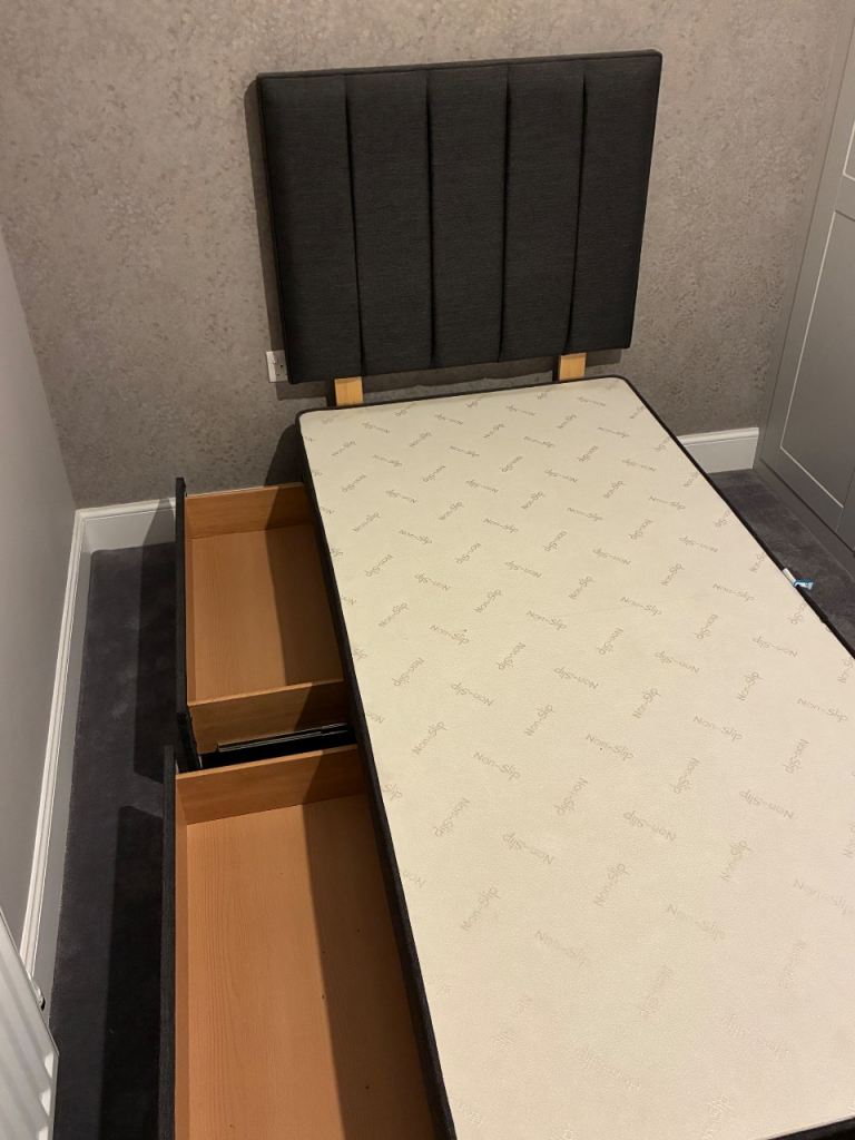 Single bed frame with headboard and two built-in storage drawers. Solid and practical, with plenty of under-bed storage.
