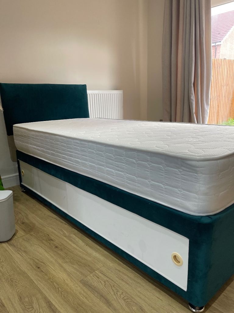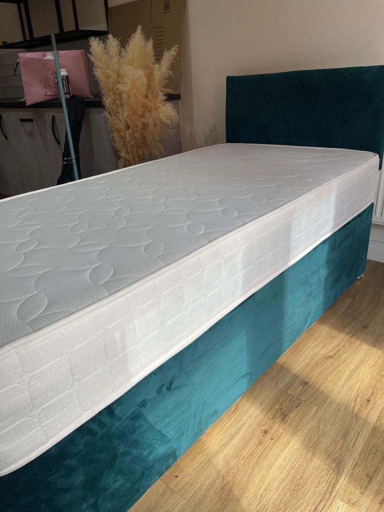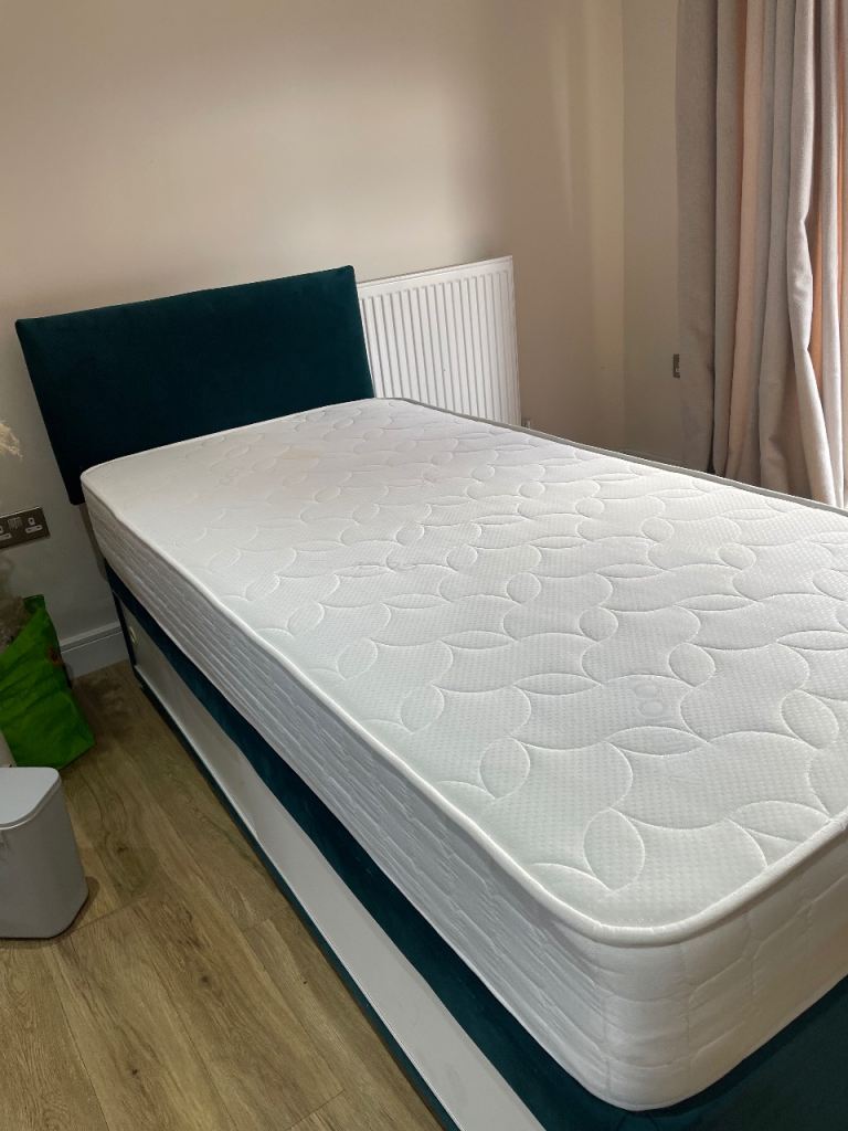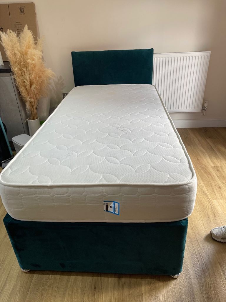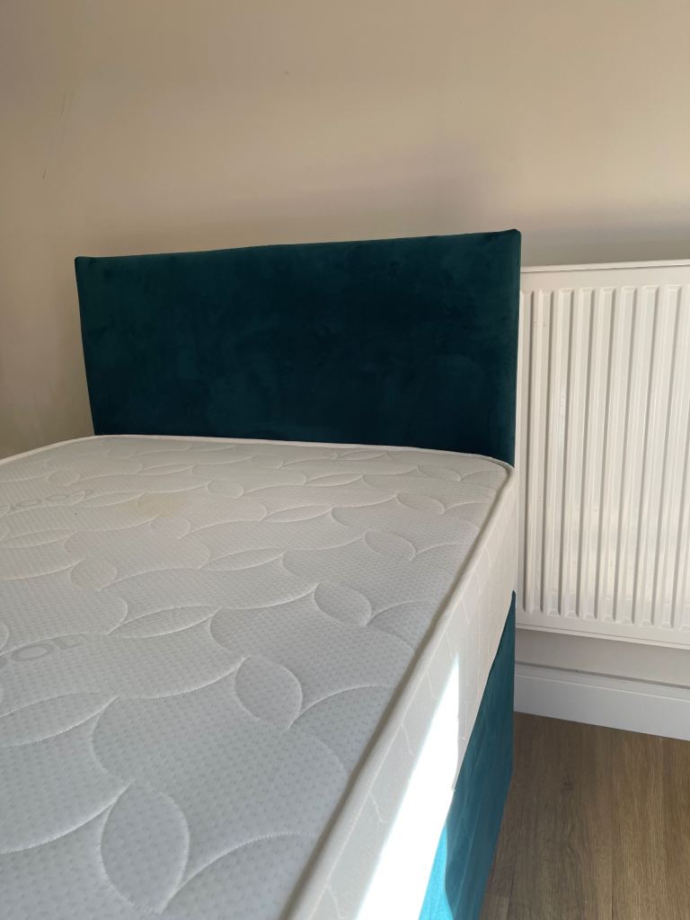 Single suede green bed frame with headboard in good condition, with single mattress. Available for collection ASAP