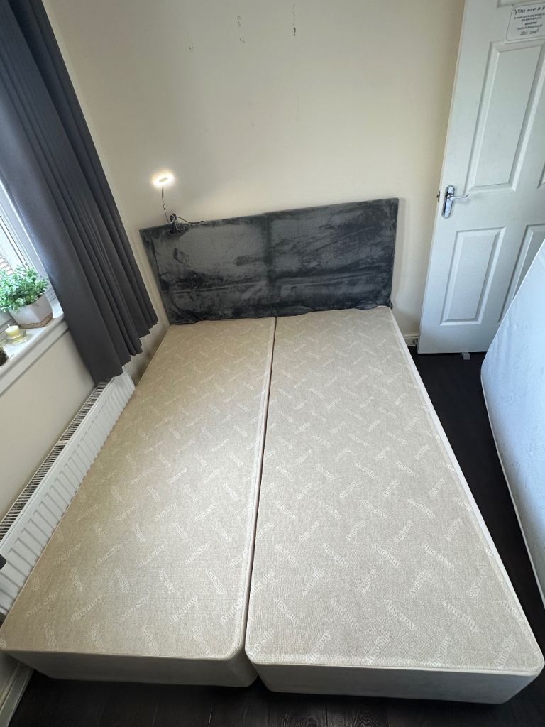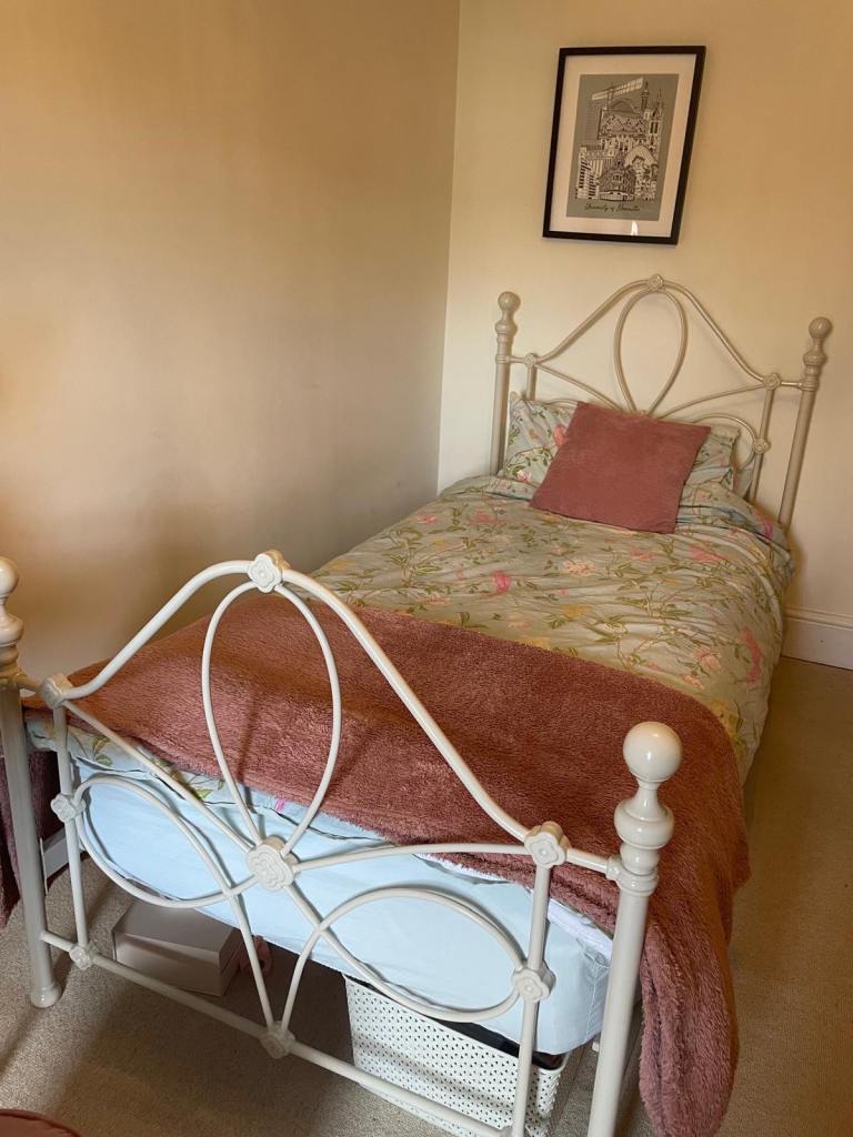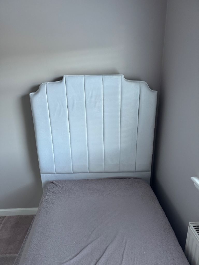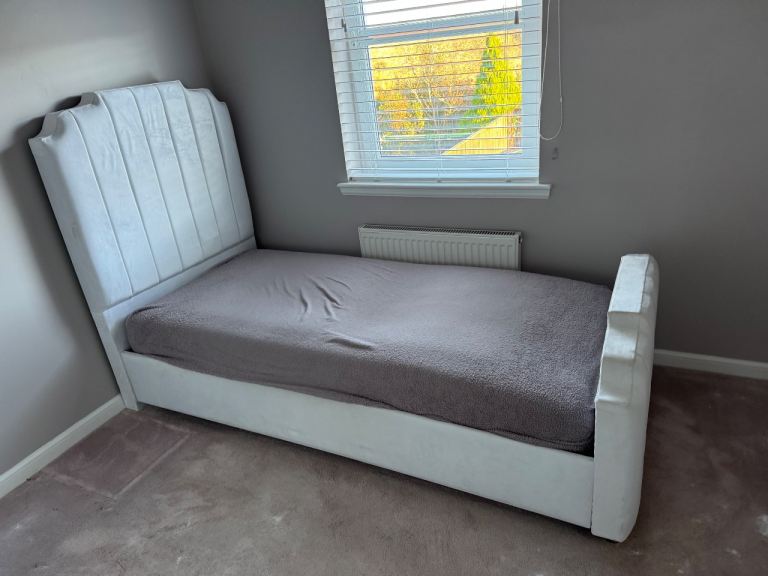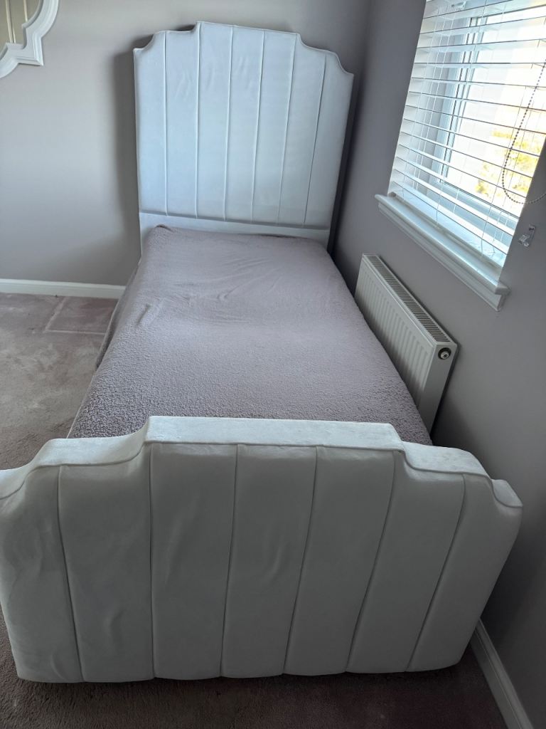 White velour single bed frame. Only a year old and in great condition. Very quick and easy to assemble, only 4 screws/bolts.