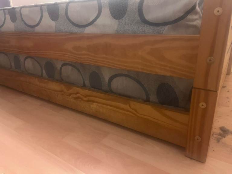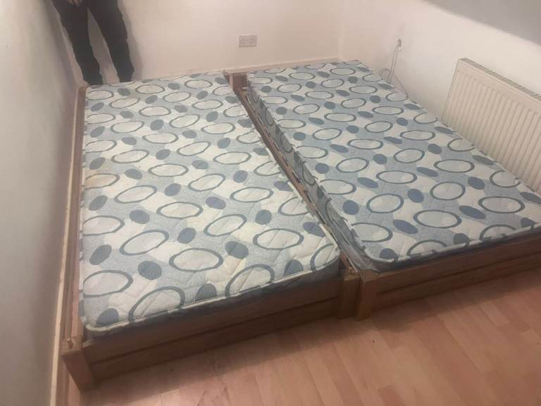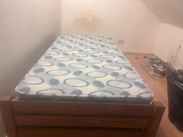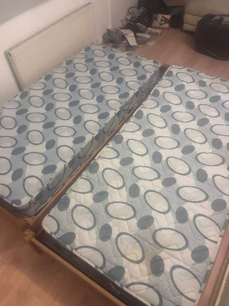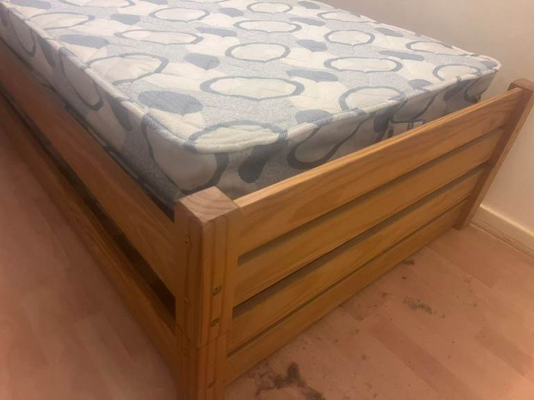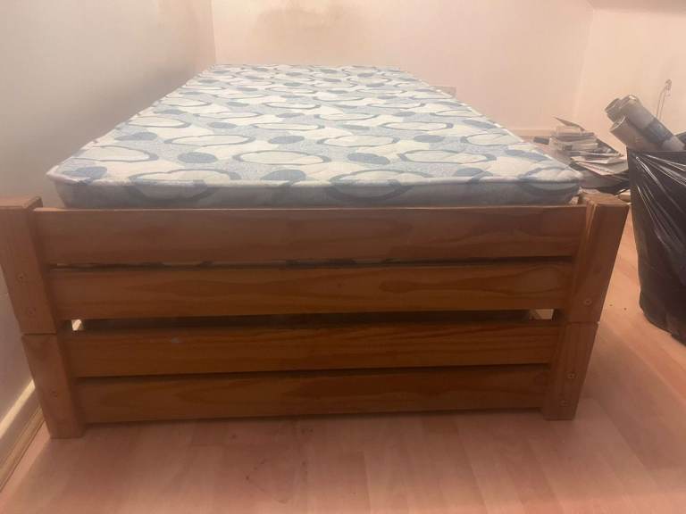 This is a solid wood bed frame with solid wood slats, Its a single bed with a single mattress , but if you lift the top part off , there is a guest bed under it, which makes 2 x single beds, when guest goes , you can make it a single bed again. The top mattress has had about 7 years use, the bottom mattress is hardly used. This sale is for the top and bottom solid wood frame and the top and bottom mattress. Cost me £299 7 years ago - No Offers
