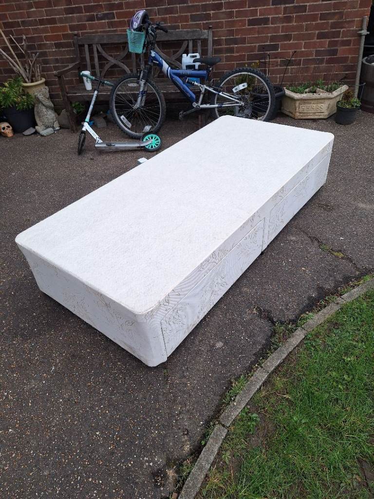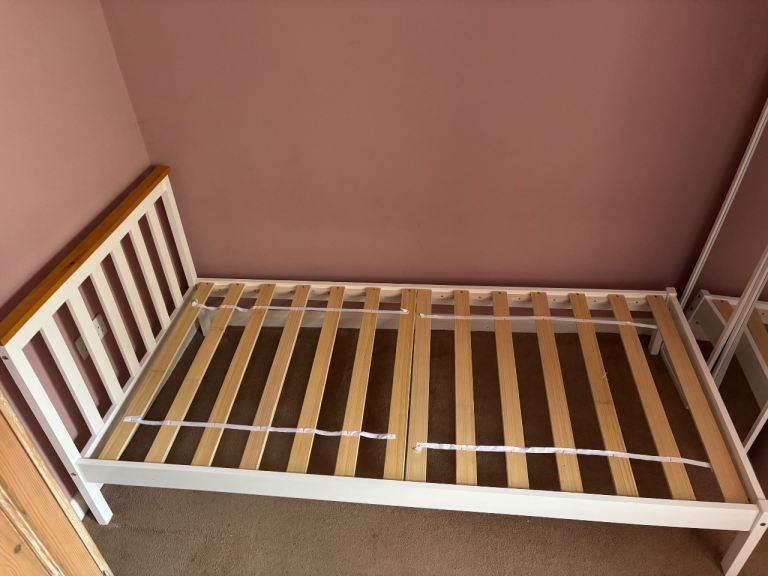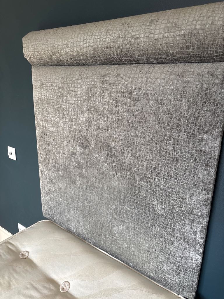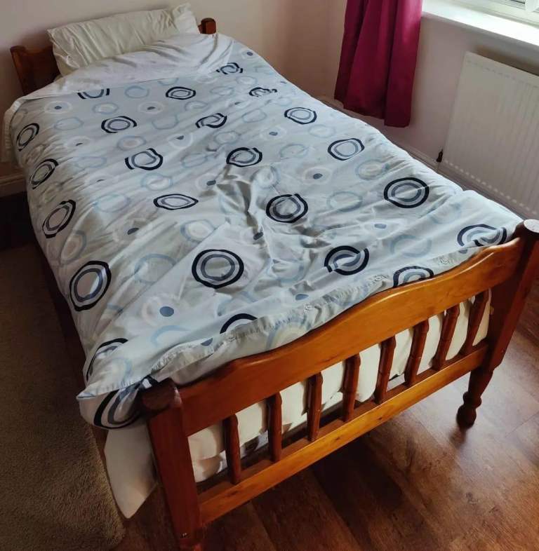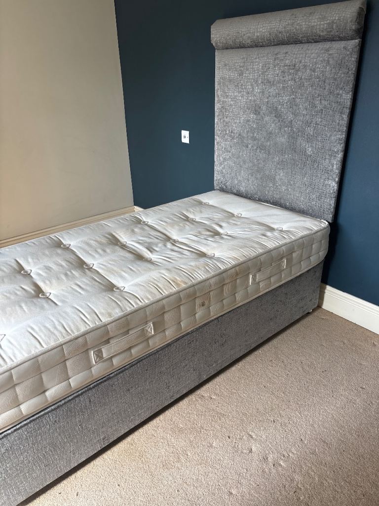 Guest single bed, clean mattress with grey tall headboard, very comfortable and selling as moving home