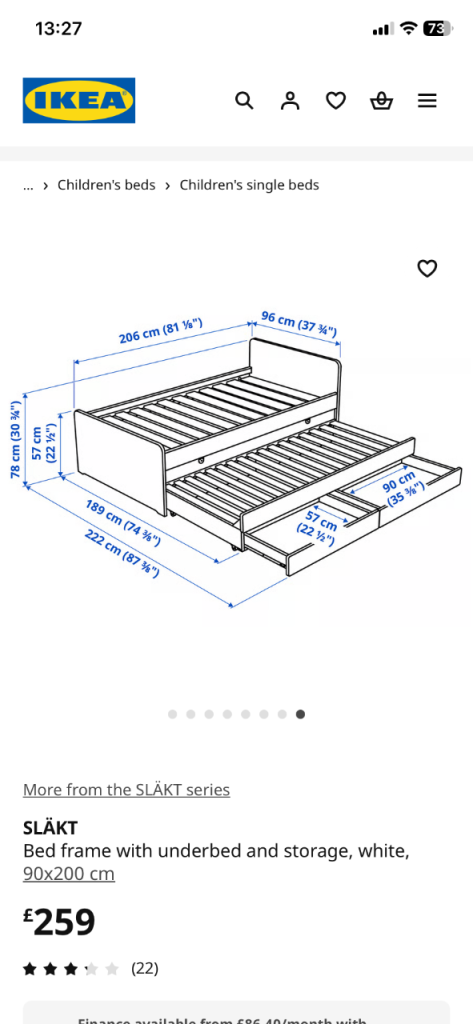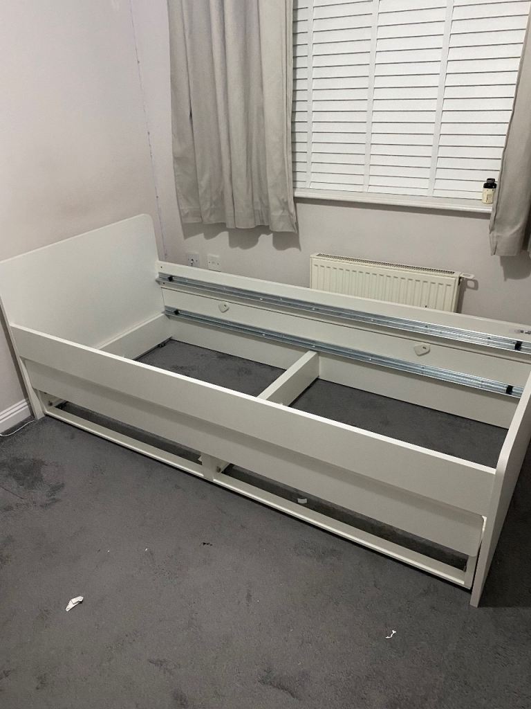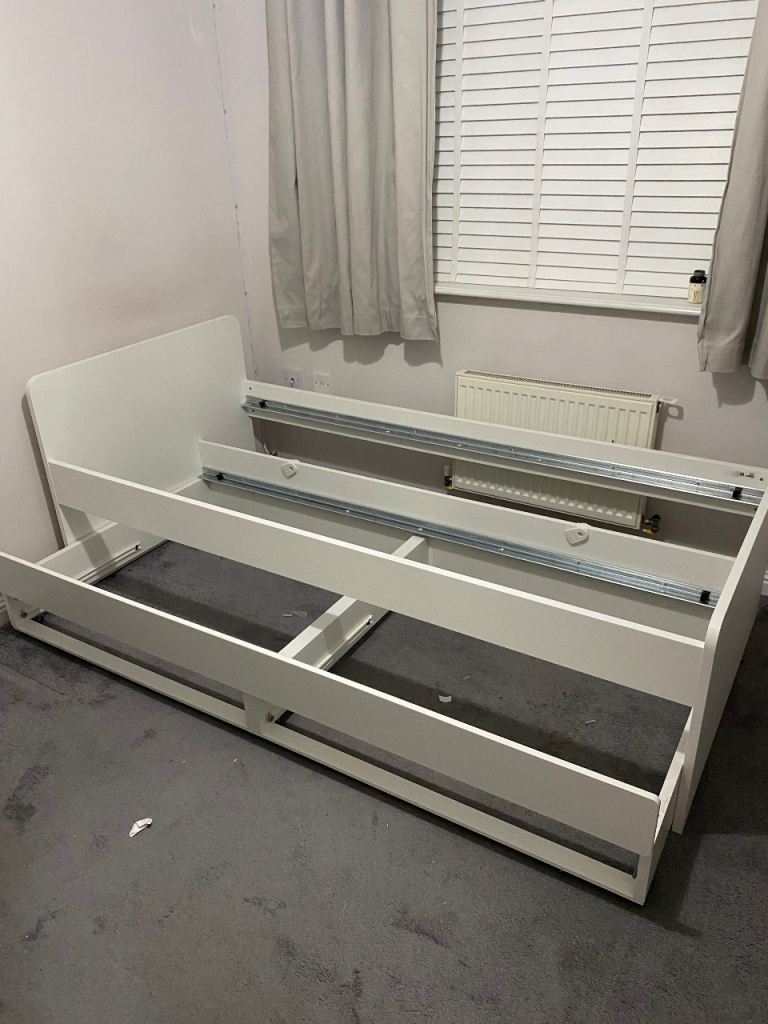 IKEA Slakt bed with underbed and 2 drawer storage. Excellent condition- only 1 year old. Comes complete with mattress for underbed and Memory Reflex Extra Deep Mattress (less the a year old) for main bed.